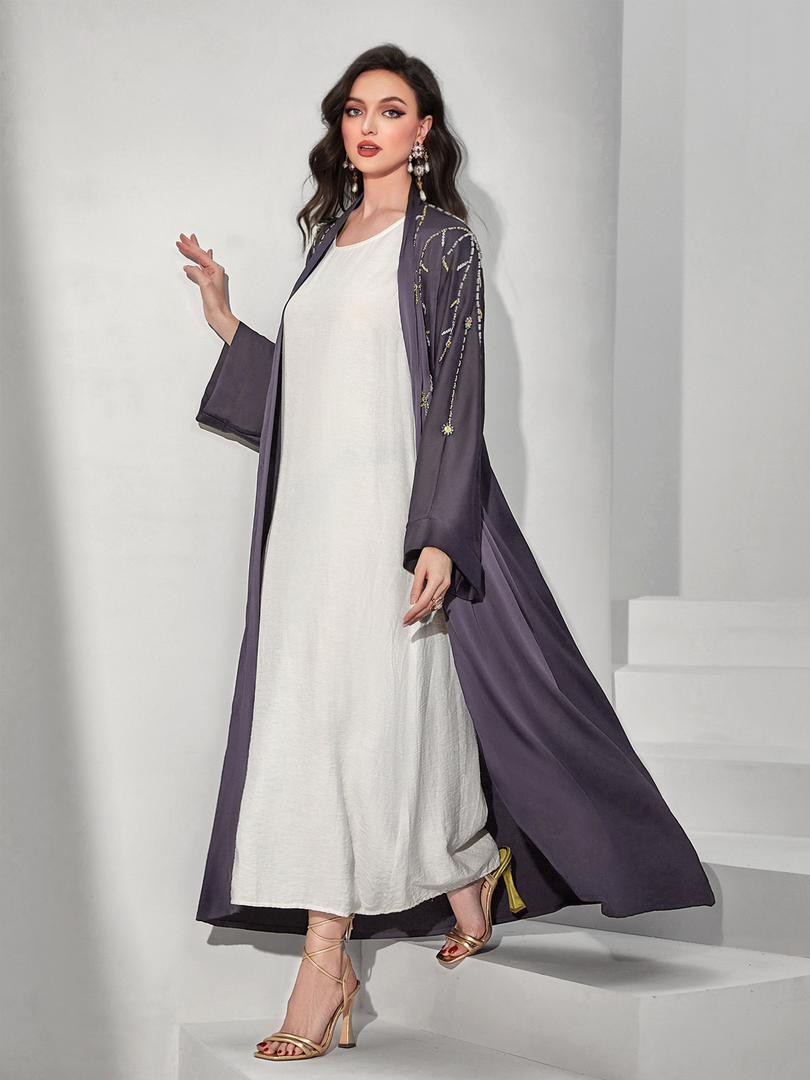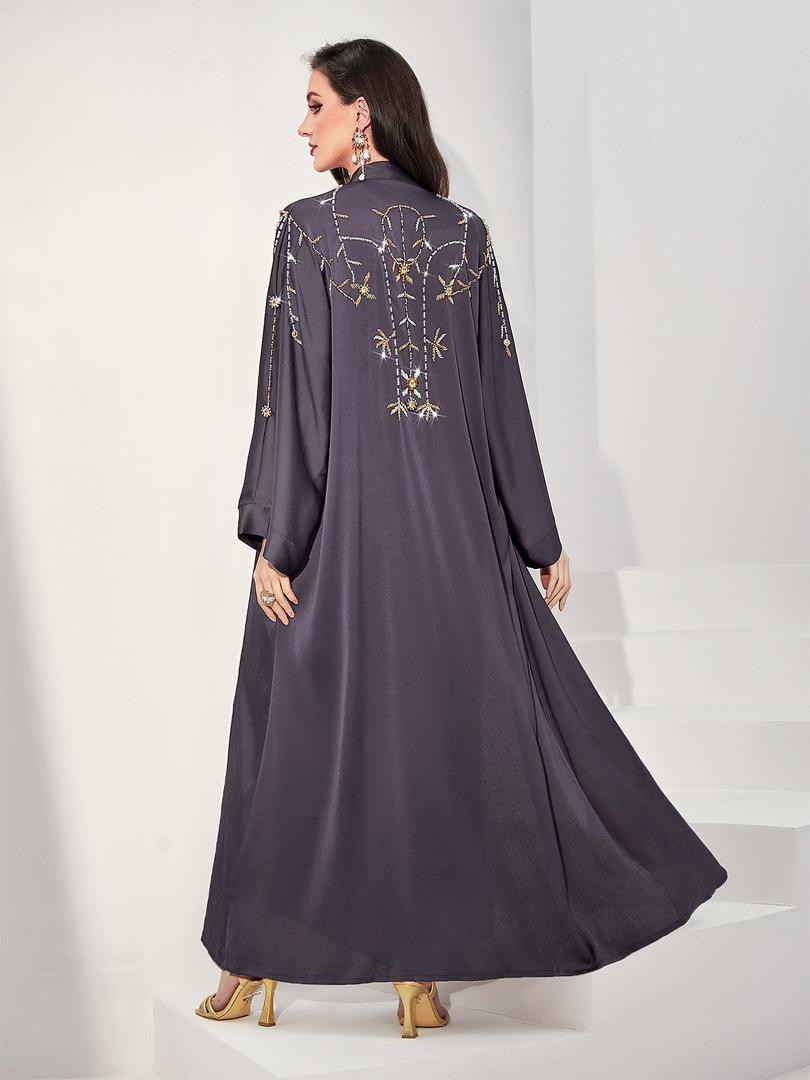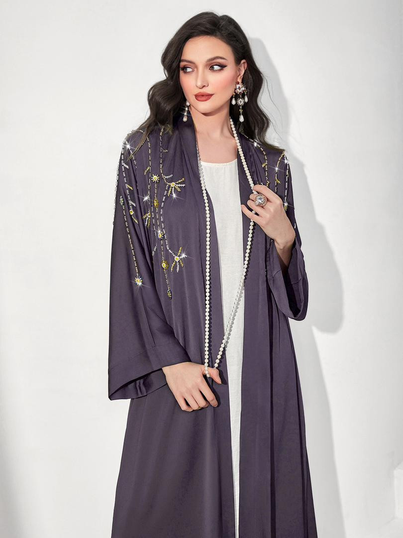عباءة نسائية طويلة بلون بنفسجي رمادي بتطريز يدوي مزين باللؤلؤ بتصميم مفتوح أنيق