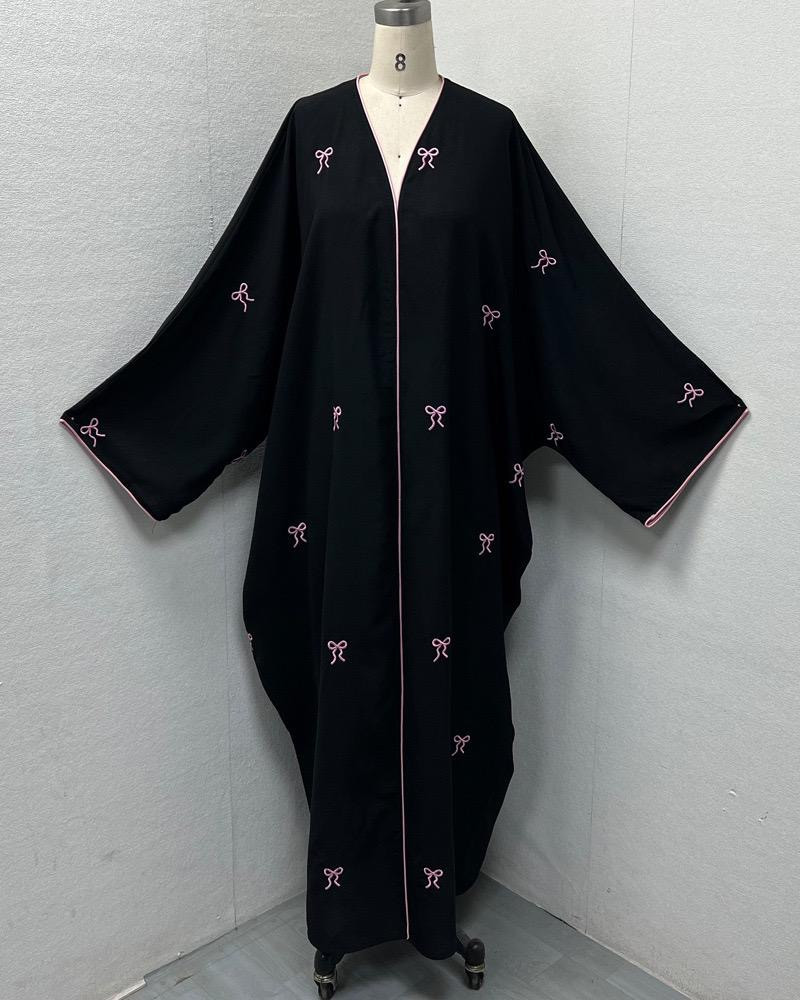 *عباية سوداء مطرزة بفيونكات وردية ناعمة – مع الشيلة*فري سايز (مقاس واحد)*