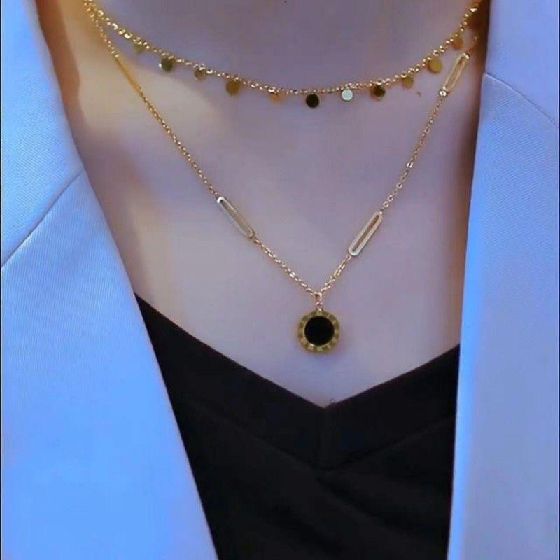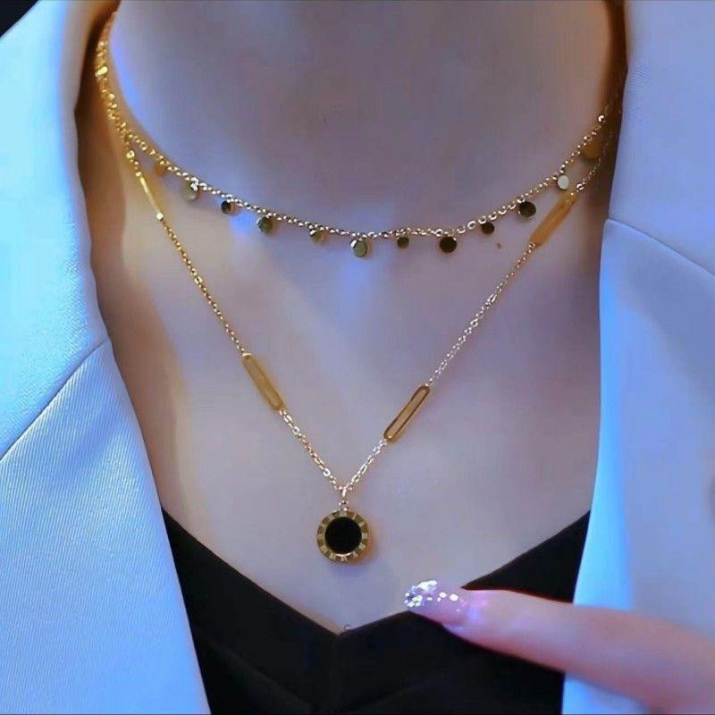 عقد نسائي فاخر من التيتانيوم – تصميم مزدوج الطبقات مع قلادة دائرية (أرقام رومانية