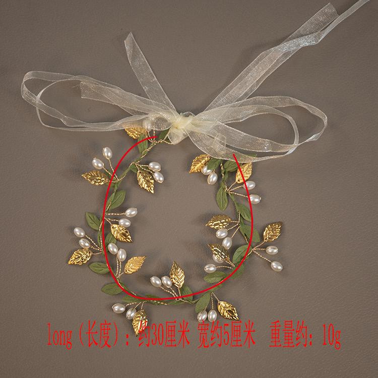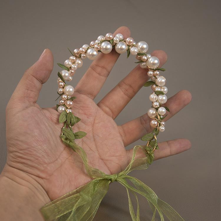 إكسسوار شعر للبنات – طوق شعر مزين باللؤلؤ وأوراق خضراء، ستايل أنيق وجميل) الألوان: أخضر بأوراق + لؤلؤ ذهبي مع أوراق خضراء