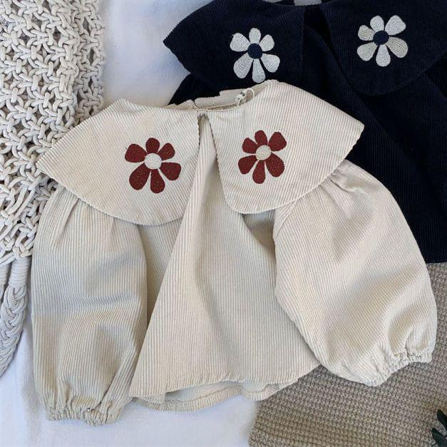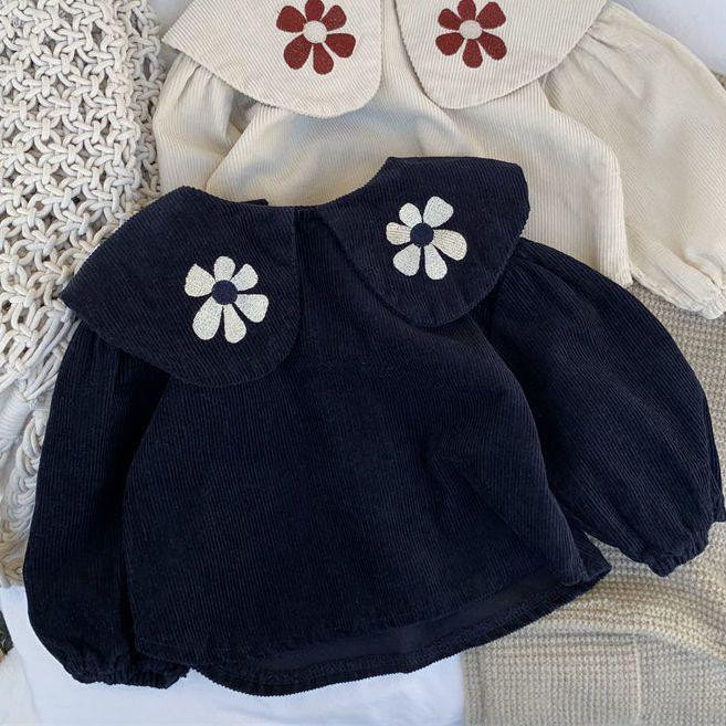 بلوزة بناتي بكشكشة على الياقة وتصميم زهور كبيرة مطرّزة بأسلوب كوري أنيق، بأكمام منفوخة طويلة لفصلي الخريف والشتاء