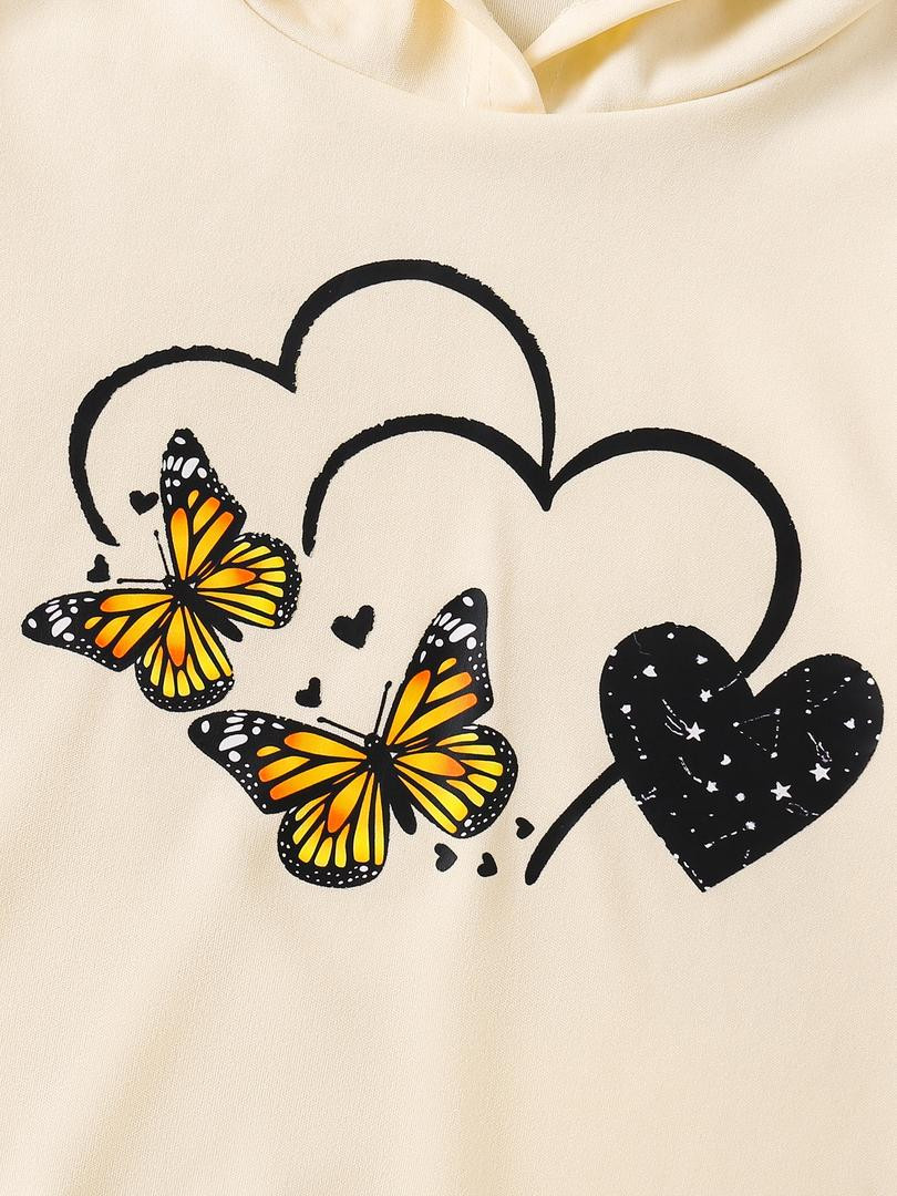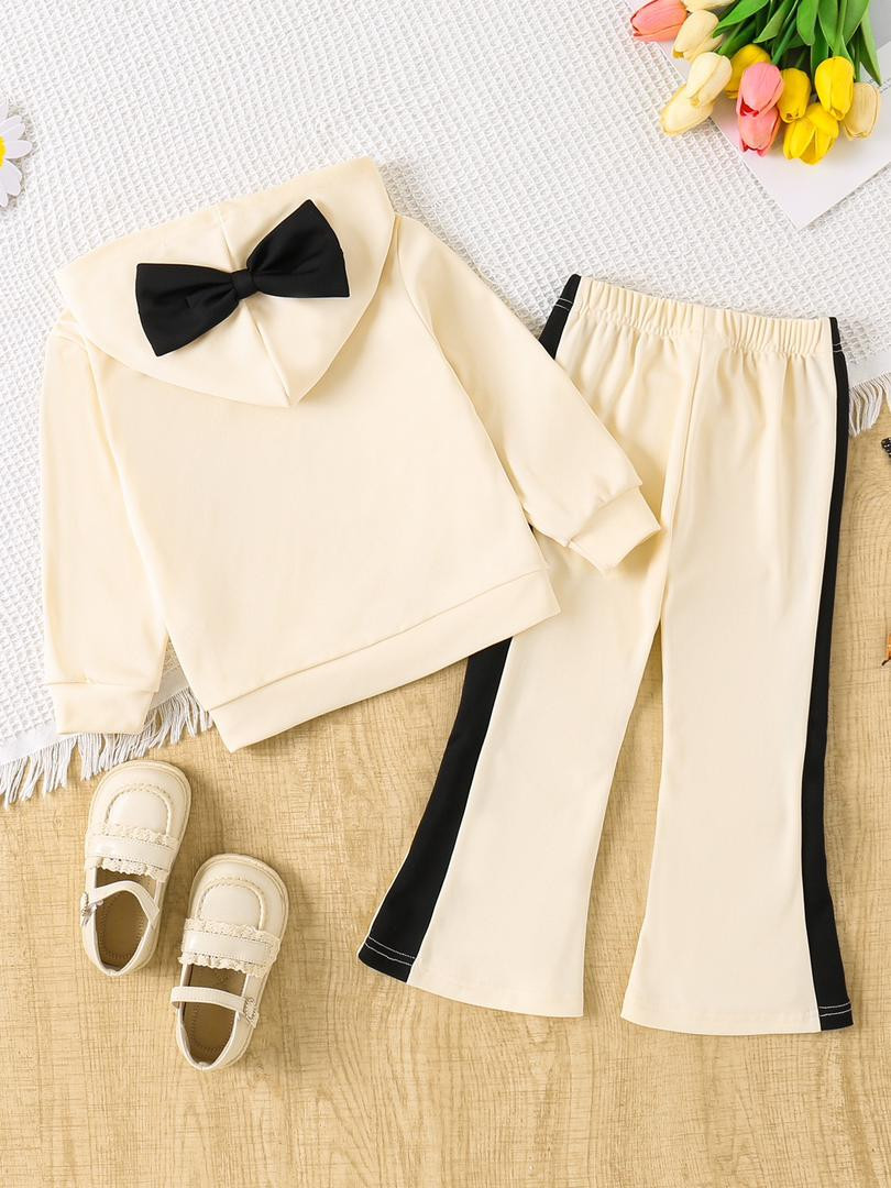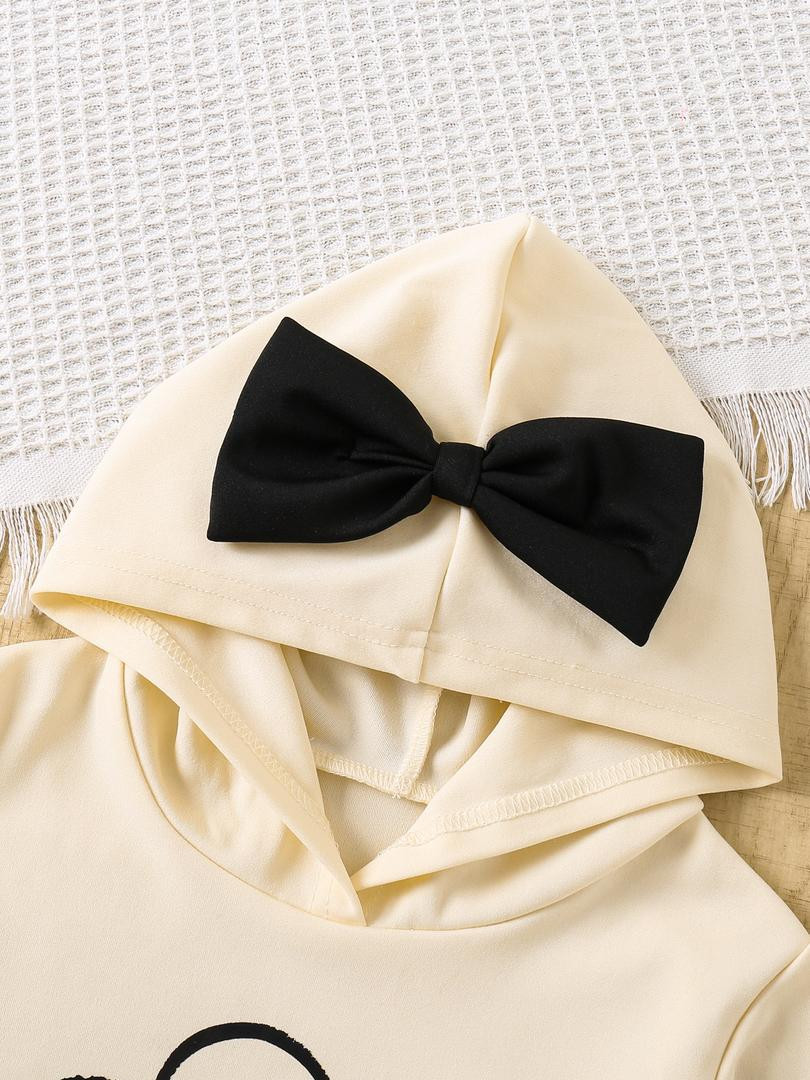 بناتي خريفي – سويت شيرت بقلنسوة بلون بيج فاتح مع طبعة كرتونية وربطة فراشة + بنطال واسع بقَصّة جرس