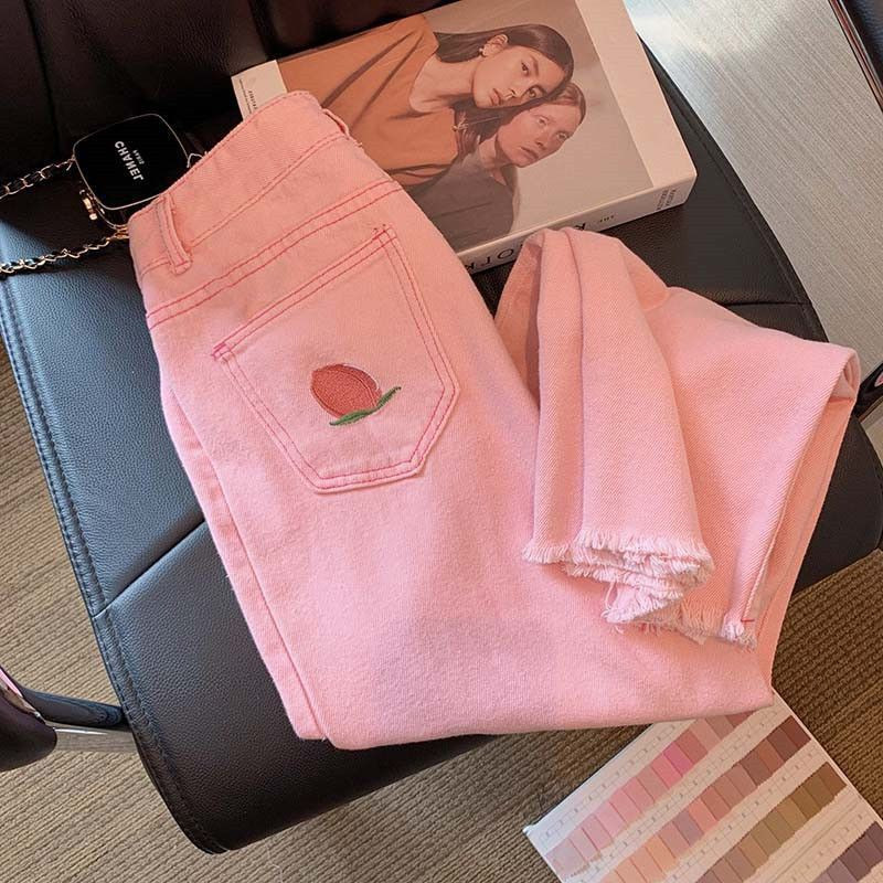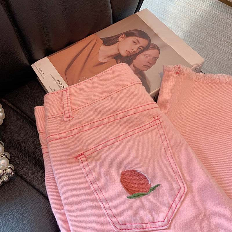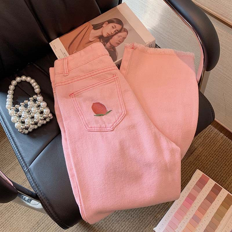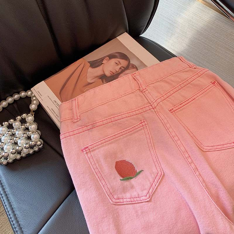 بنطال دنيم بناتي بقطعة خوخ مطرزة
