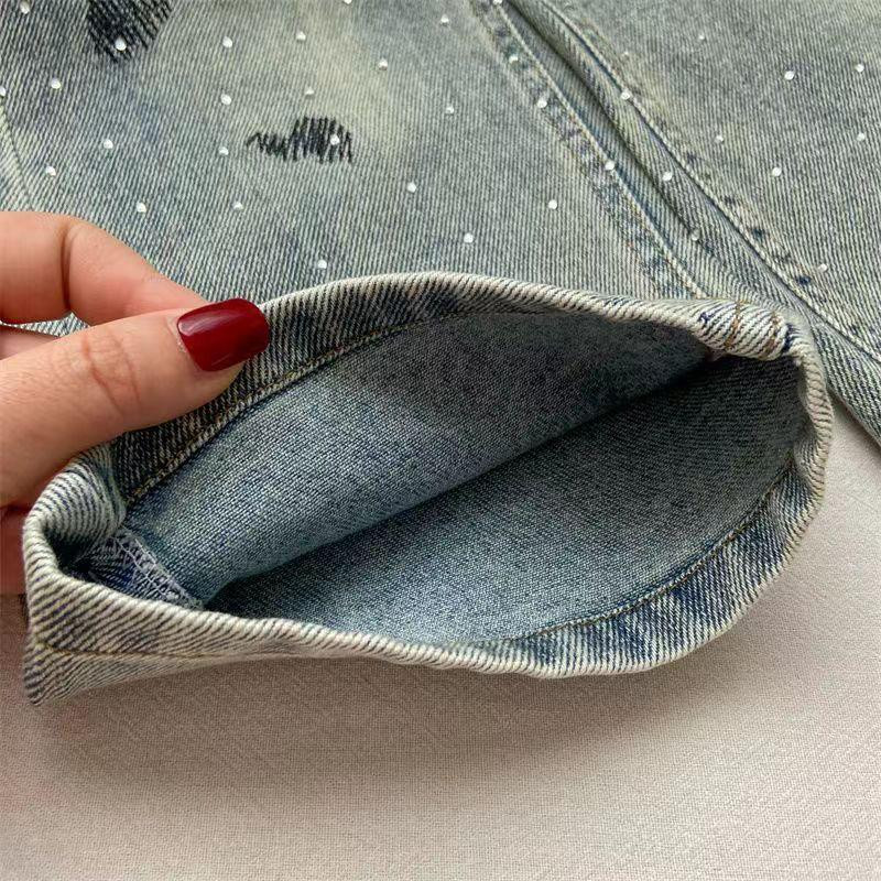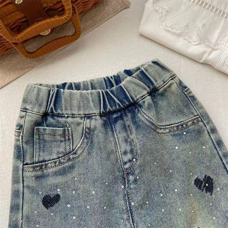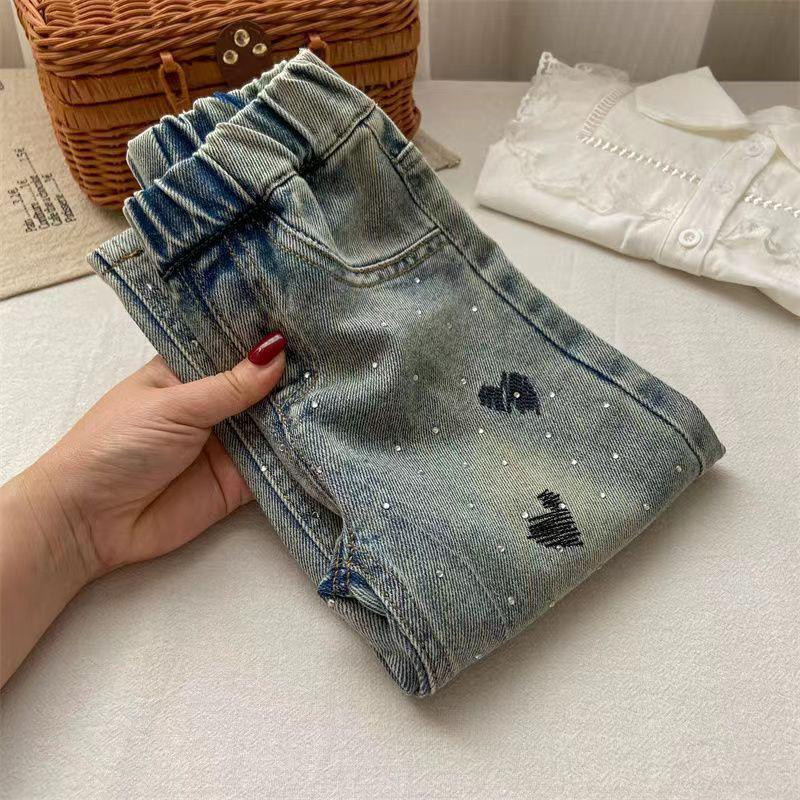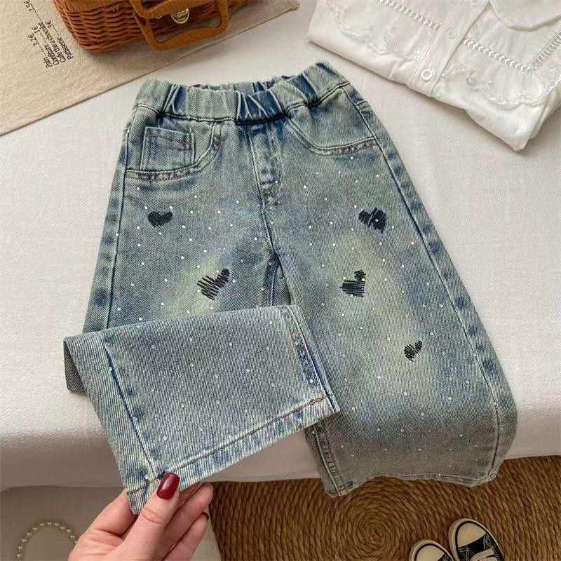 بنطال جينز مستقيم للبنات مزين بقلوب لامعة (مناسب لفصل الربيع والخريف)