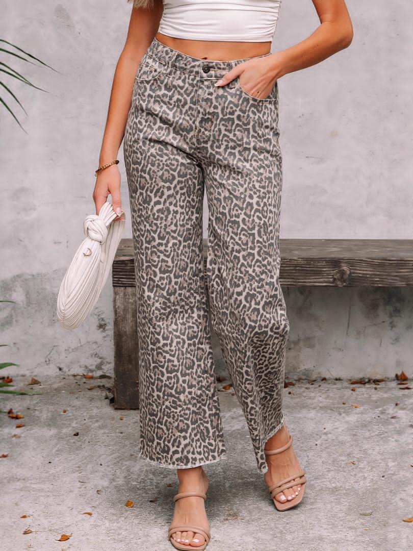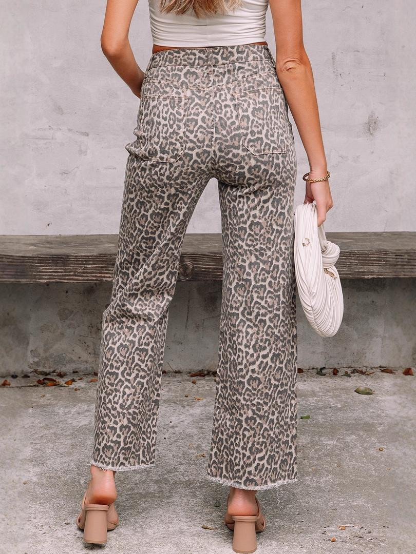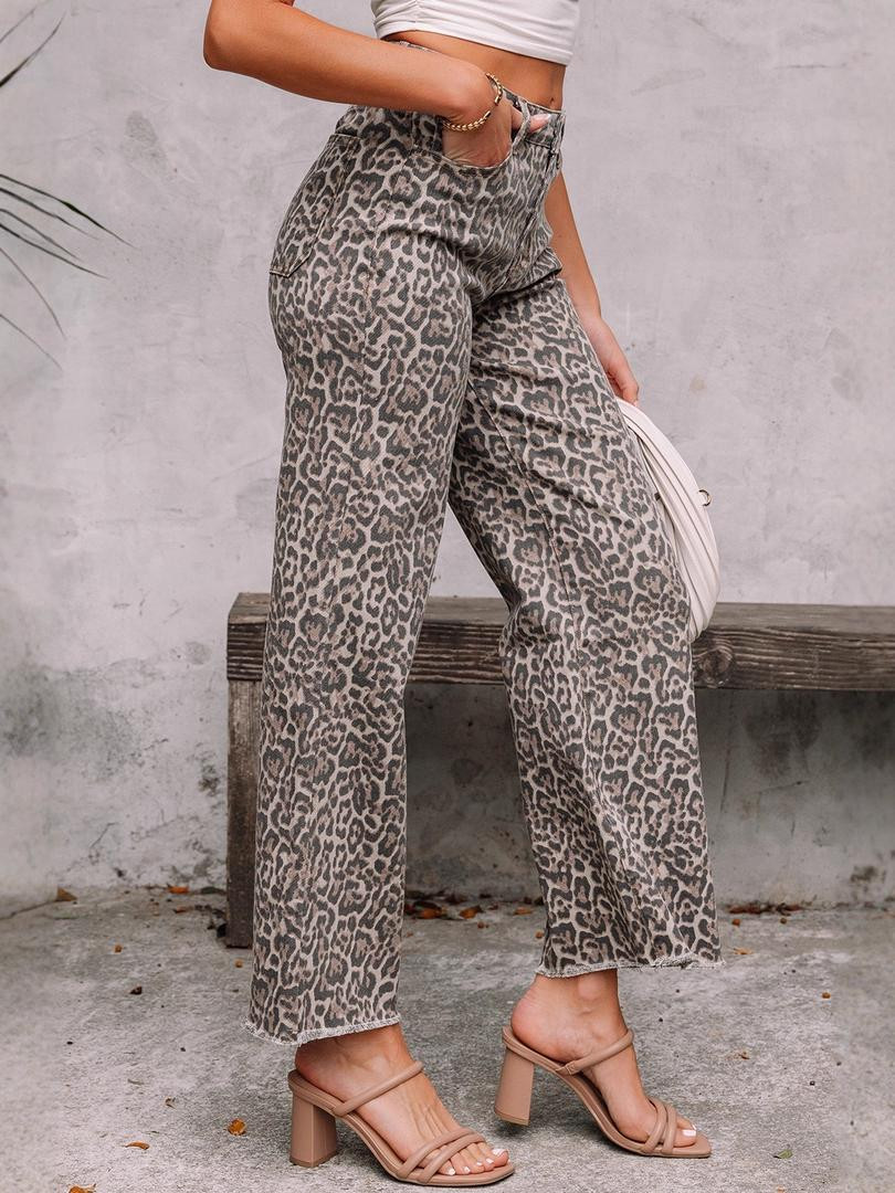 بنطال جينز نسائي جديد بخصر عالٍ وتصميم مطبوع بنقشة فهد، بقصّة مستقيمة بطابع أوروبي عصري ومظهر شبابي أنيق
