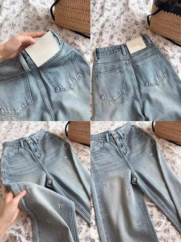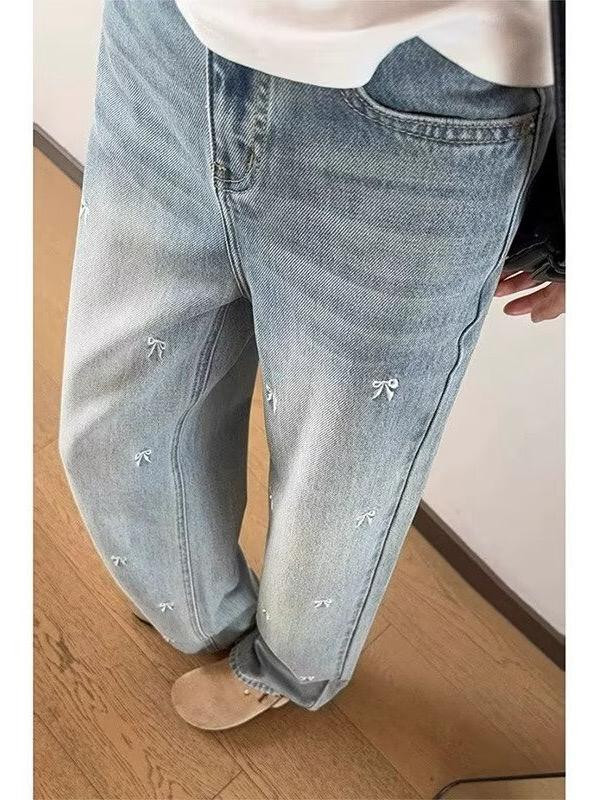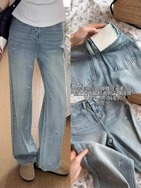 بنطال جينز واسع بقلوب فراشة مطرّزة للنساء، موديل ربيع، مقاس كبير مناسب للممتلئات