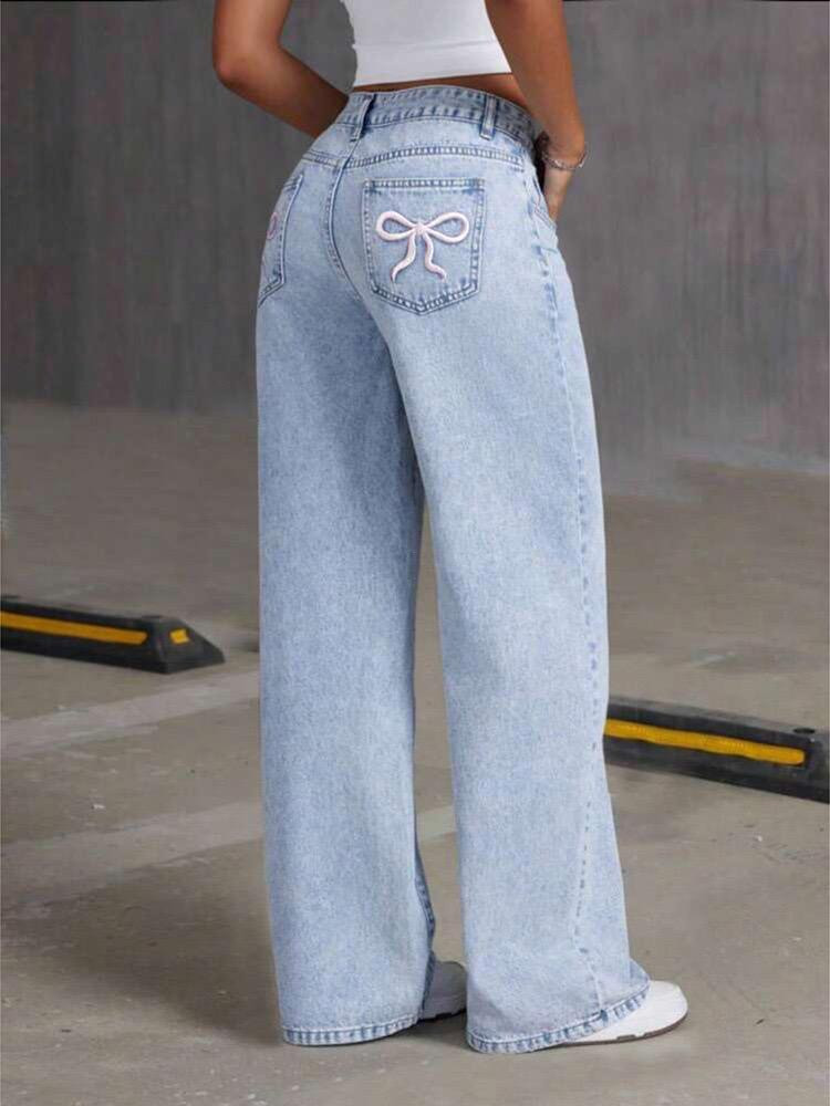 بنطال جينز واسع بقَصّة شبابية وتطريزات (قلوب، ورود