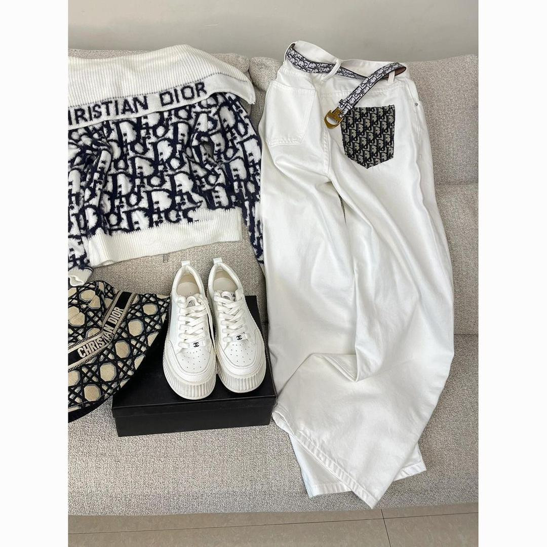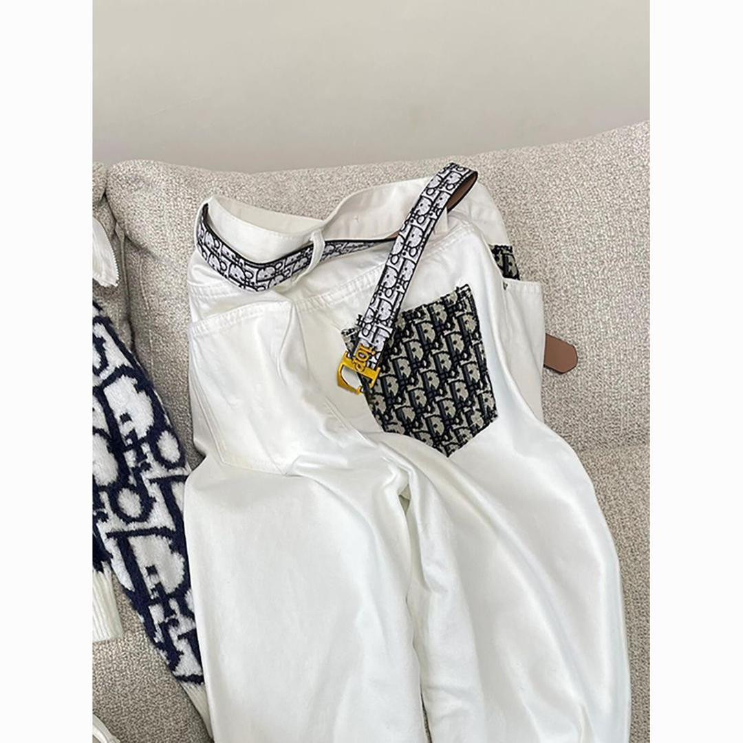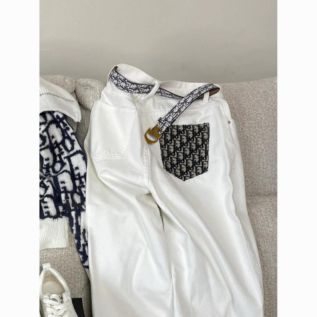 بنطلون جينز نسائي أبيض، بجيوب مزخرفة Dior، قصة مستقيمة، ربيع وخريف 2025، تصميم شبابي عصري