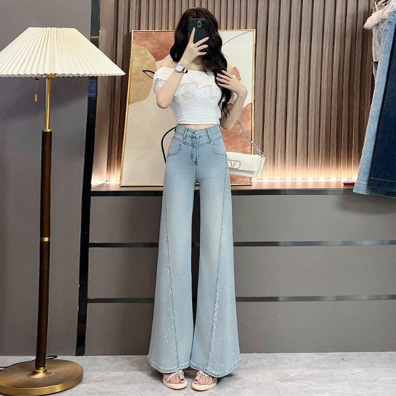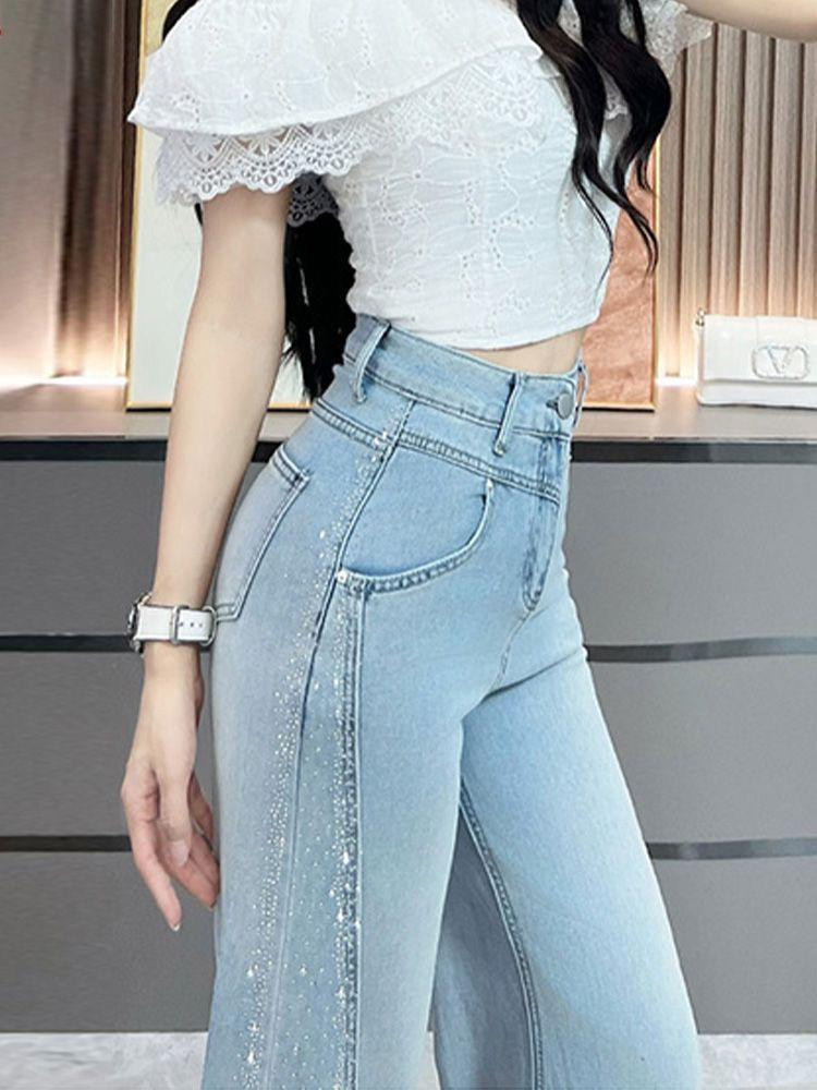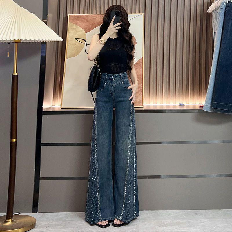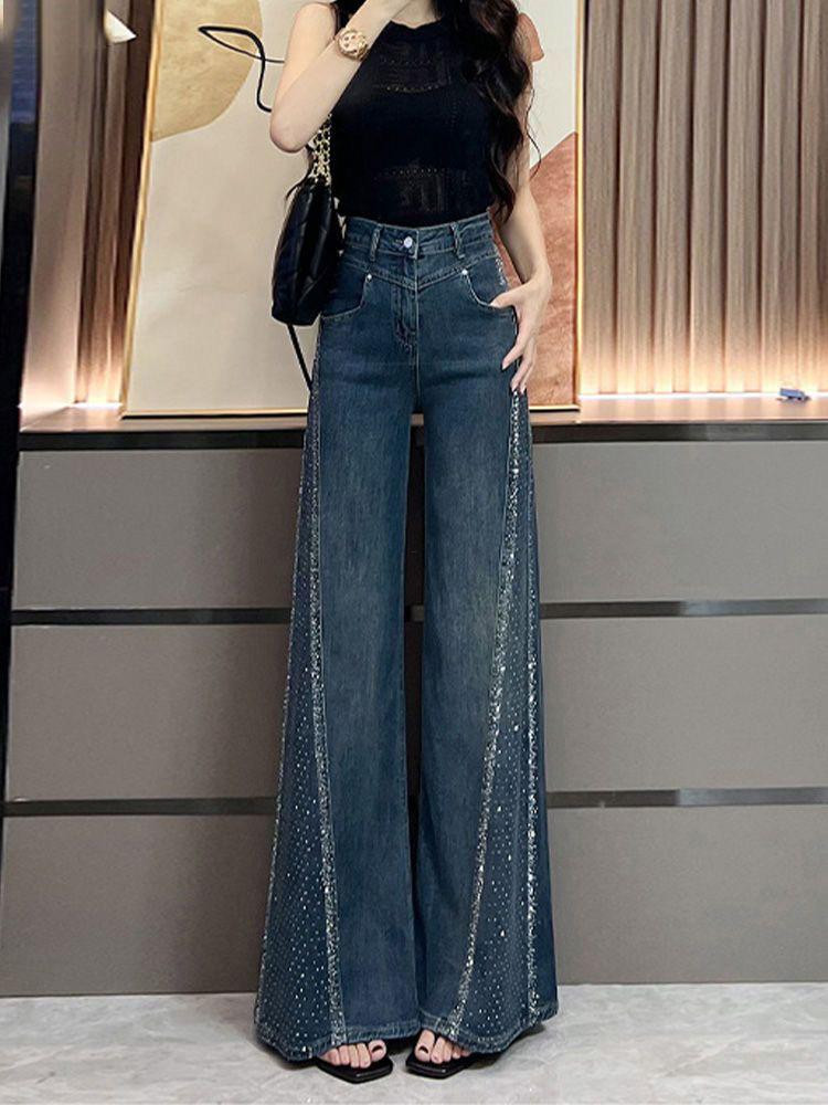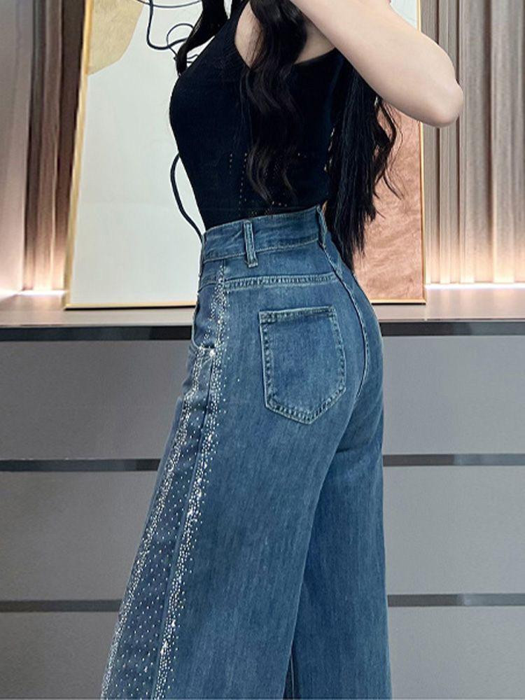 بنطلون جينز نسائي واسع الساق (قَصّة شارلستون)، مزين بالكريستال، ربيع وصيف 2025، ستايل عصري للبنات، تصميم كاجوال متنوع ومواكب للموضة، قصة مستقيمة