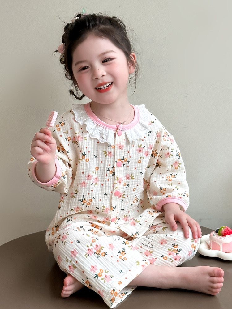 بيجامة أطفال بناتي طويلة – كم وبنطال بنقشة ورد