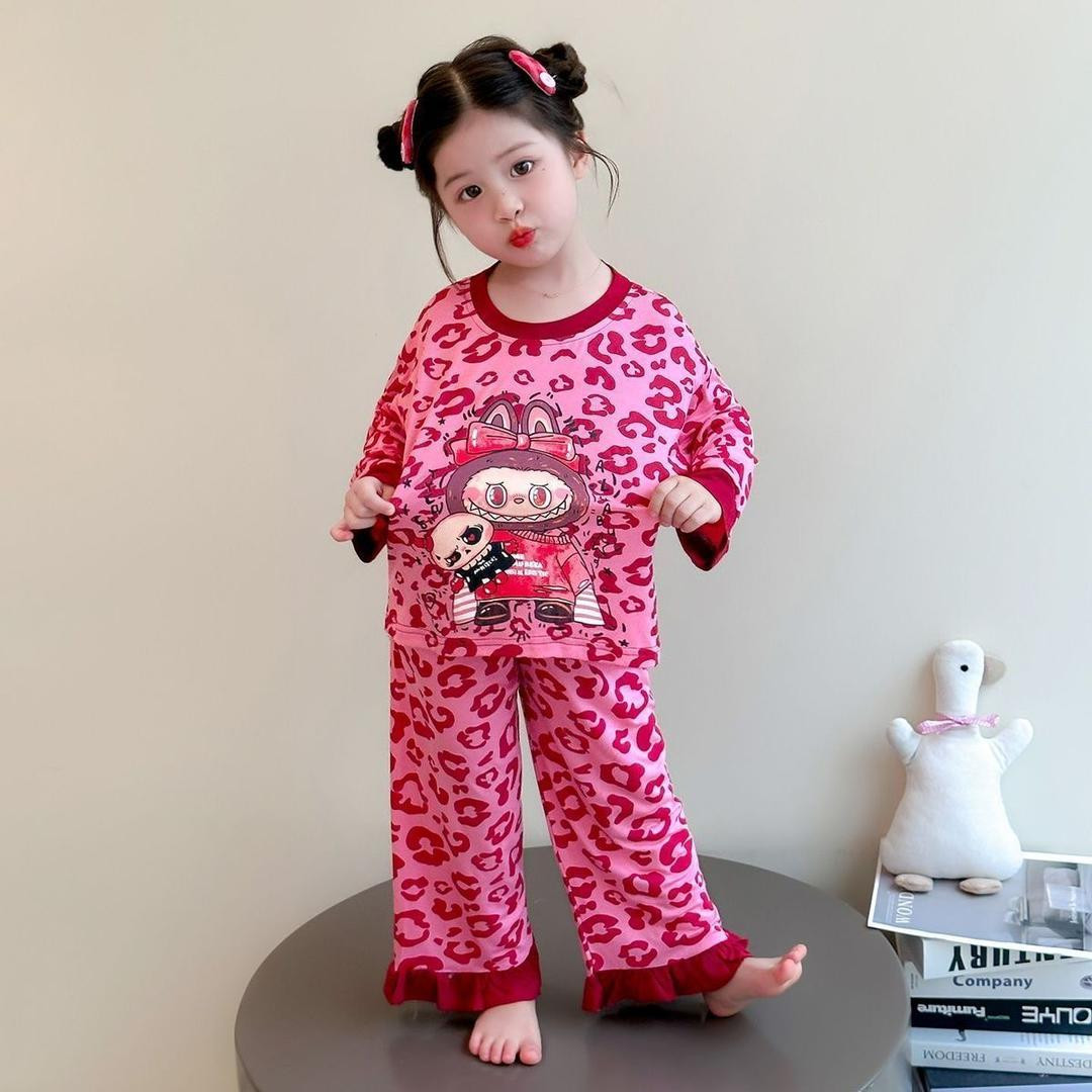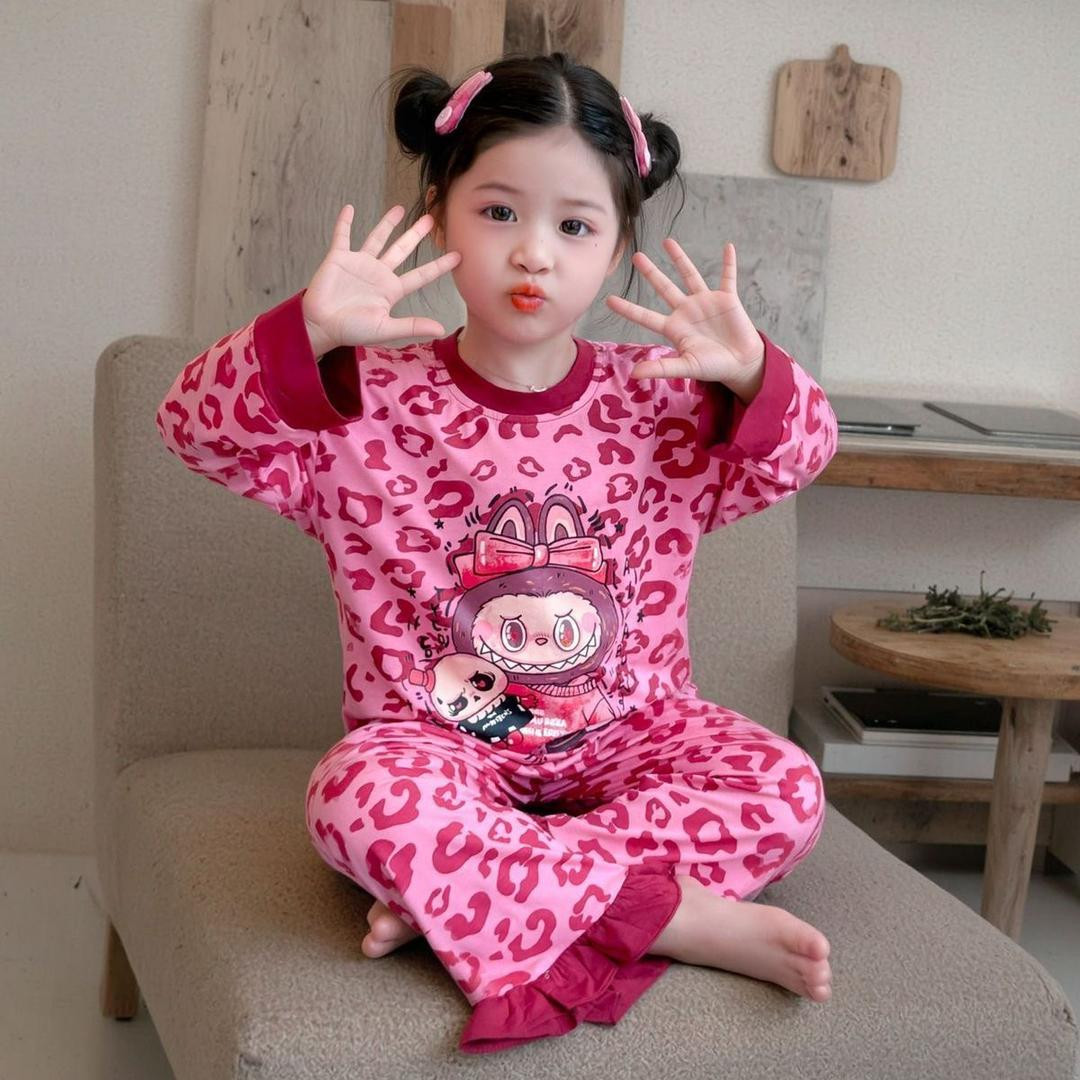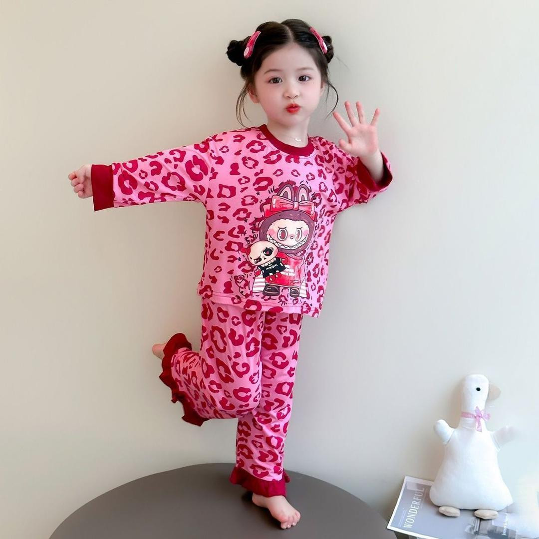 بيجامة بنات – ستايل ليوبارد (وردية) – طقم كامل من قماش دافئ طويل الأكمام