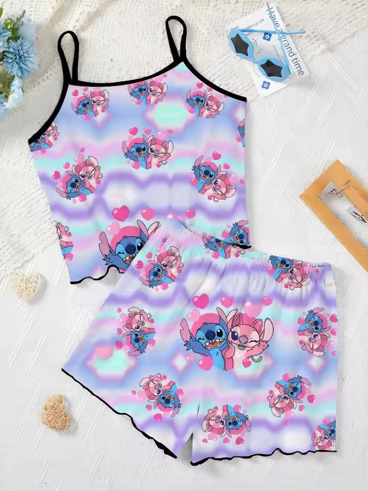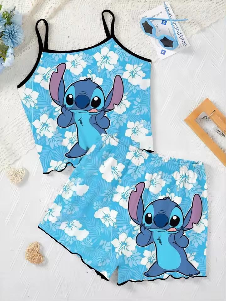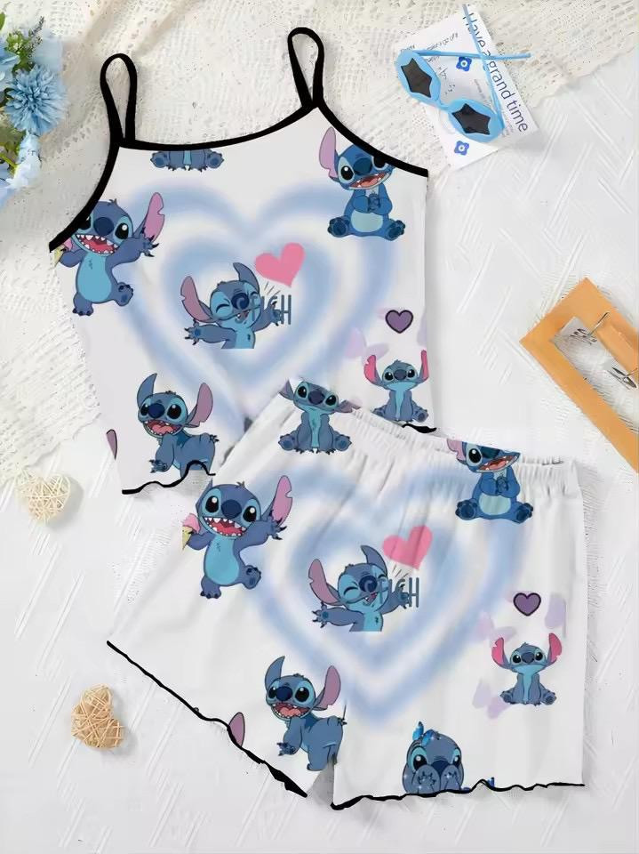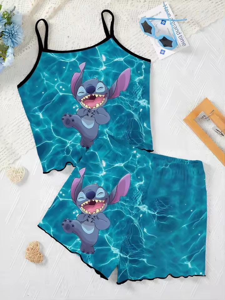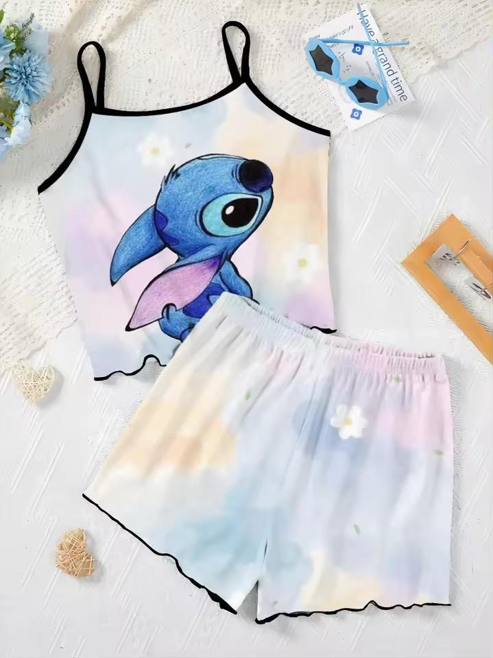بيجامة نسائية صيفية جديدة بحمالة وشورت بطبعة ستيتش، موضة رائجة في أوروبا وأمريكا