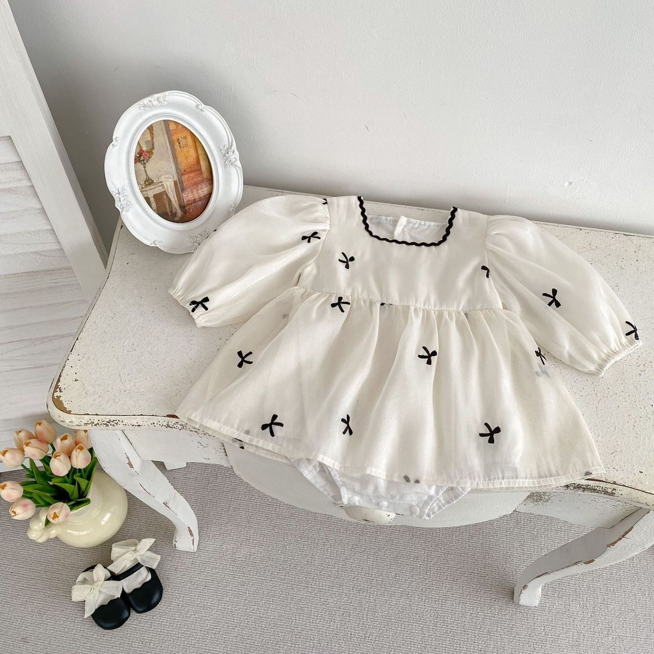 فستان الأميرات الأبيض - تصميم أنيق بنقشات فيونكات سوداء