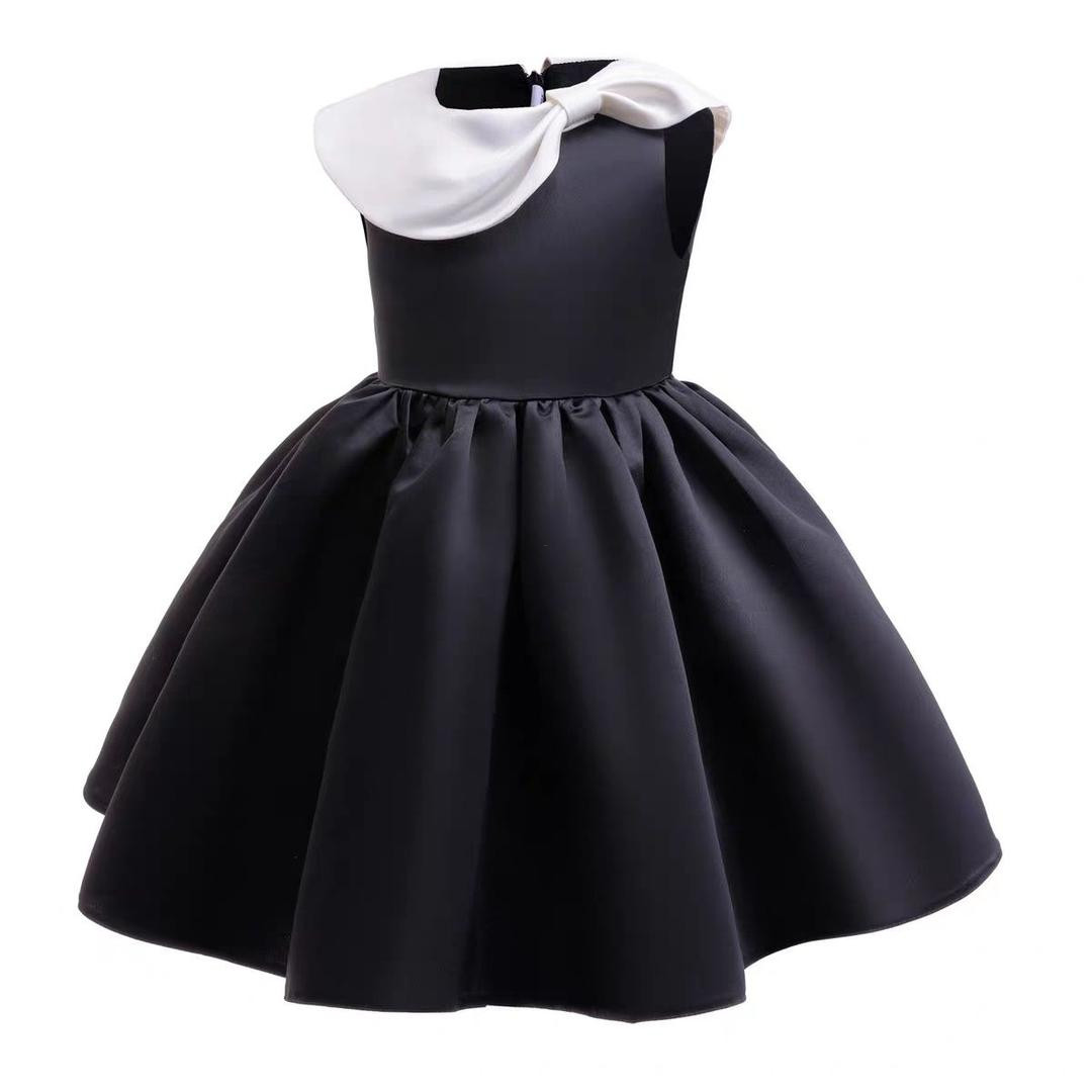 فستان أميرة بناتي بتصميم كلاسيكي فاخر ?✨، مصنوع من قماش ساتان ناعم بلونين أسود وأبيض، بتصميم ياقة مقلوبة أنيق ولمسة فخمة تناسب الحفلات والمناسبات الخاصة