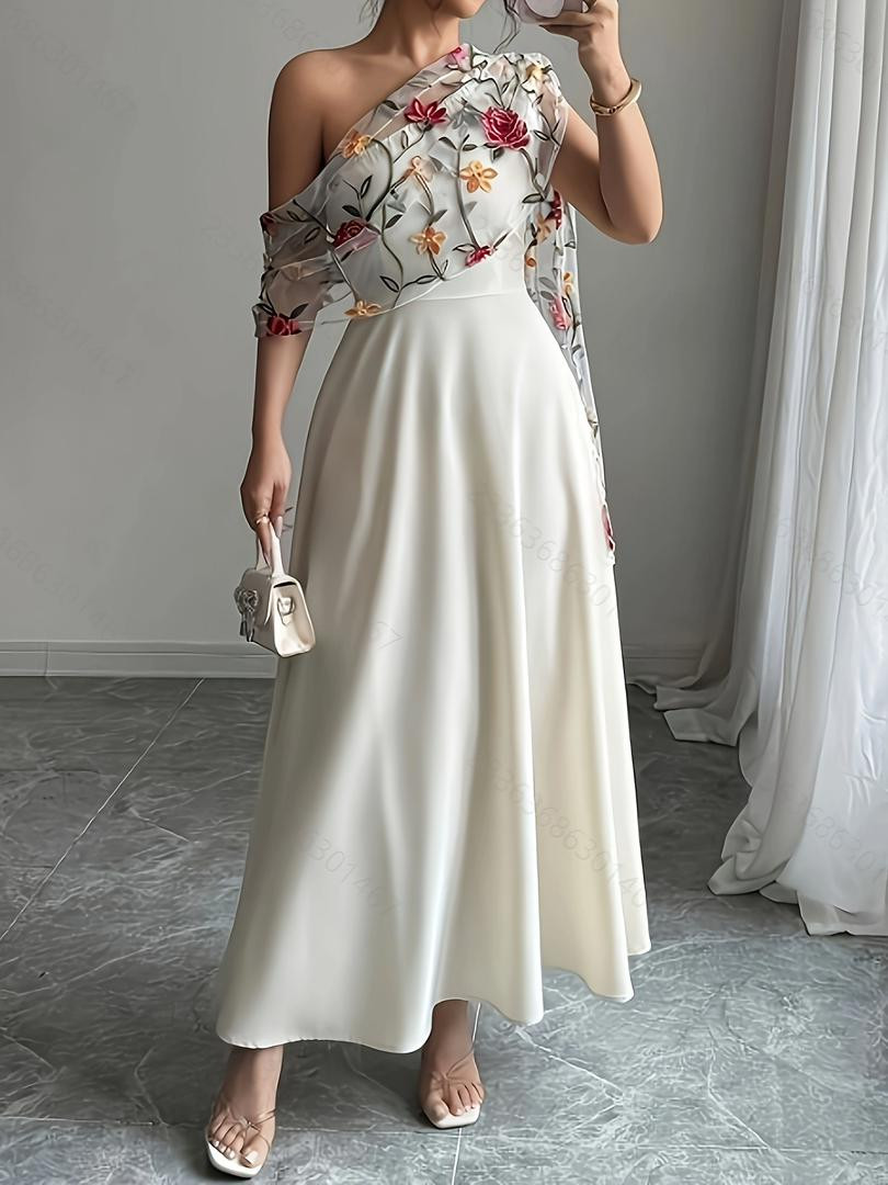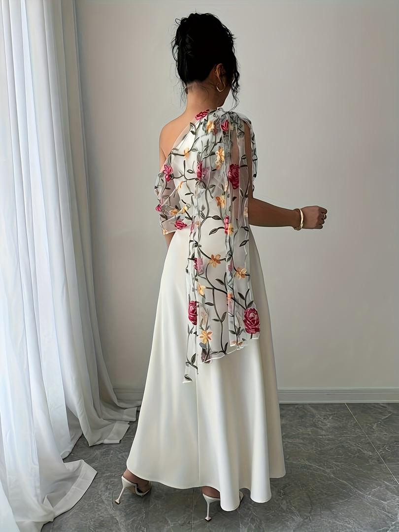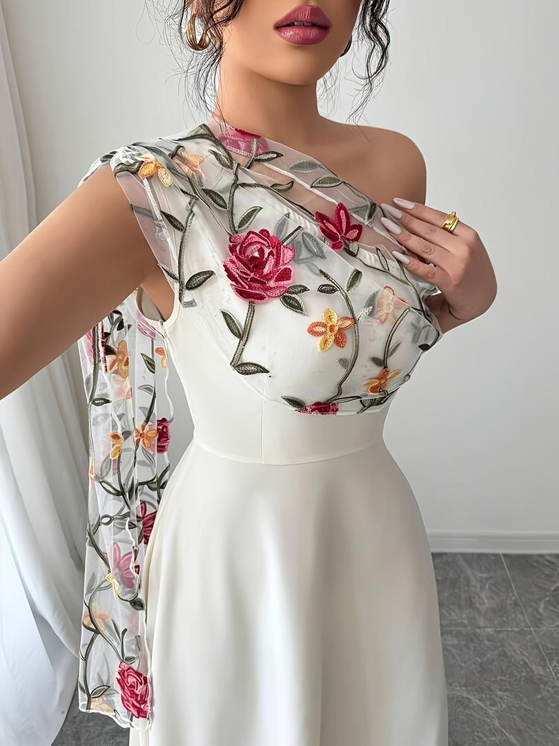فستان أنيق بكتف مائل بتطريز زهور ناعمة من التول وبقصة خصر تحدد القوام بلمسة راقية