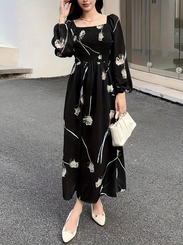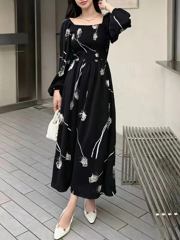 "فستان أسود مزخرف بالورود مع أكمام منفوشة"