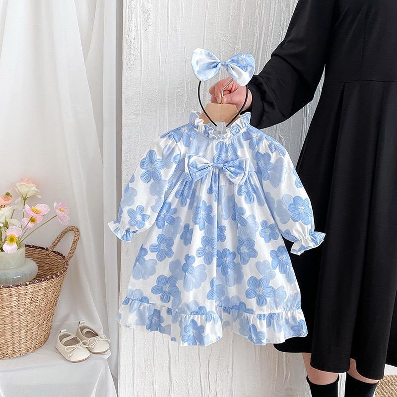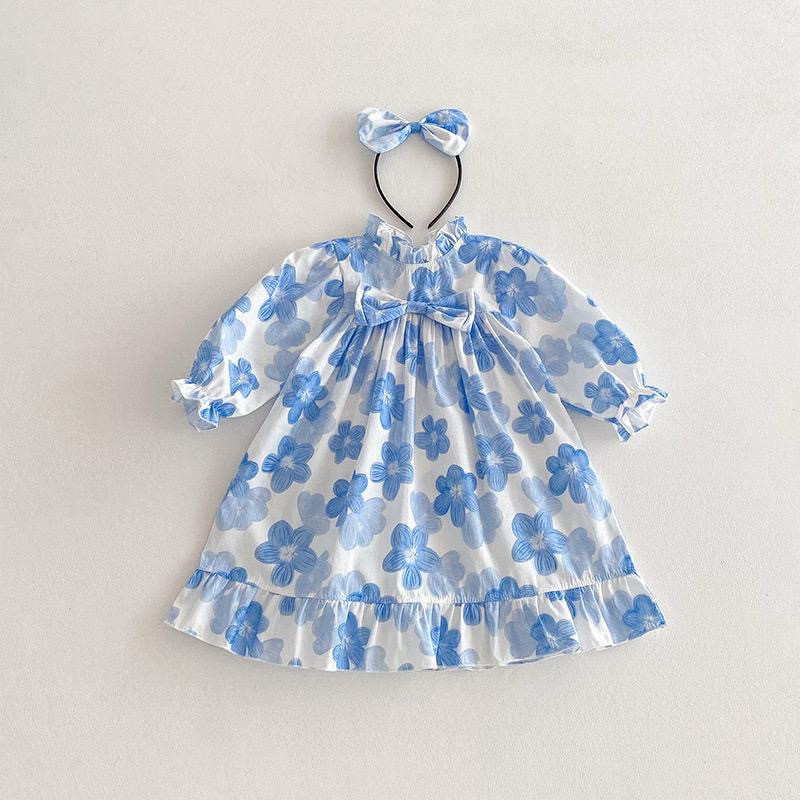 "فستان أطفال مزخرف بالزهور الزرقاء مع رباط رأس"