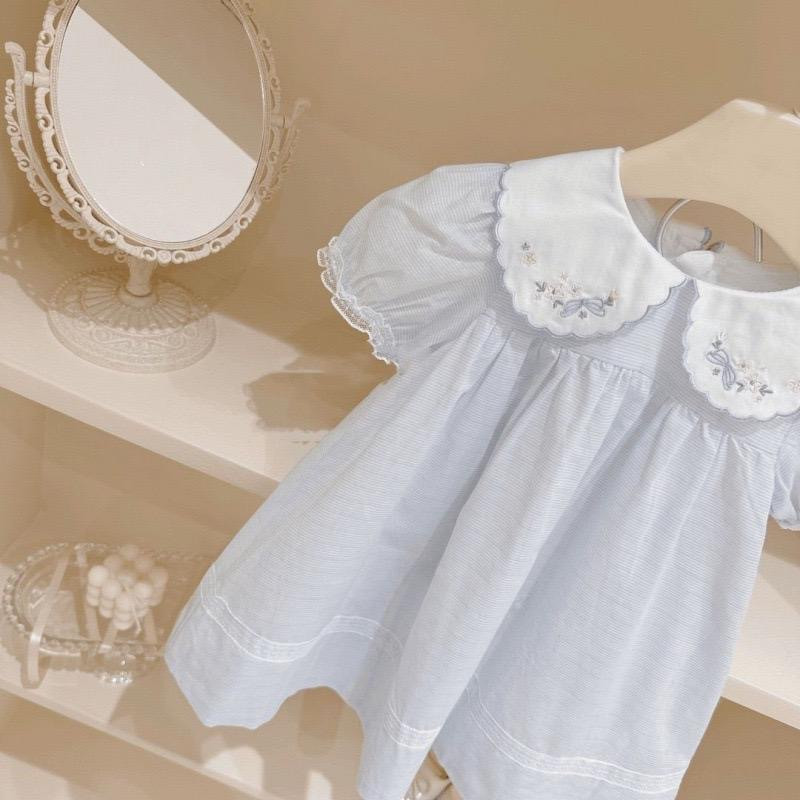 *فستان أطفال سماوي بأكمام منفوشة وياقة مطرزة بالزهور *