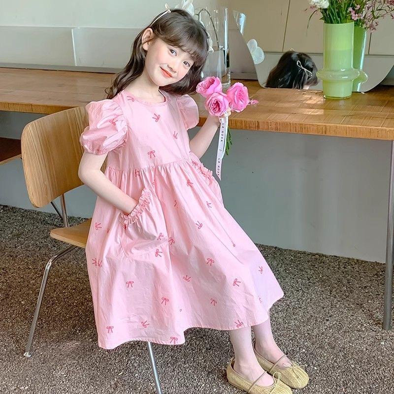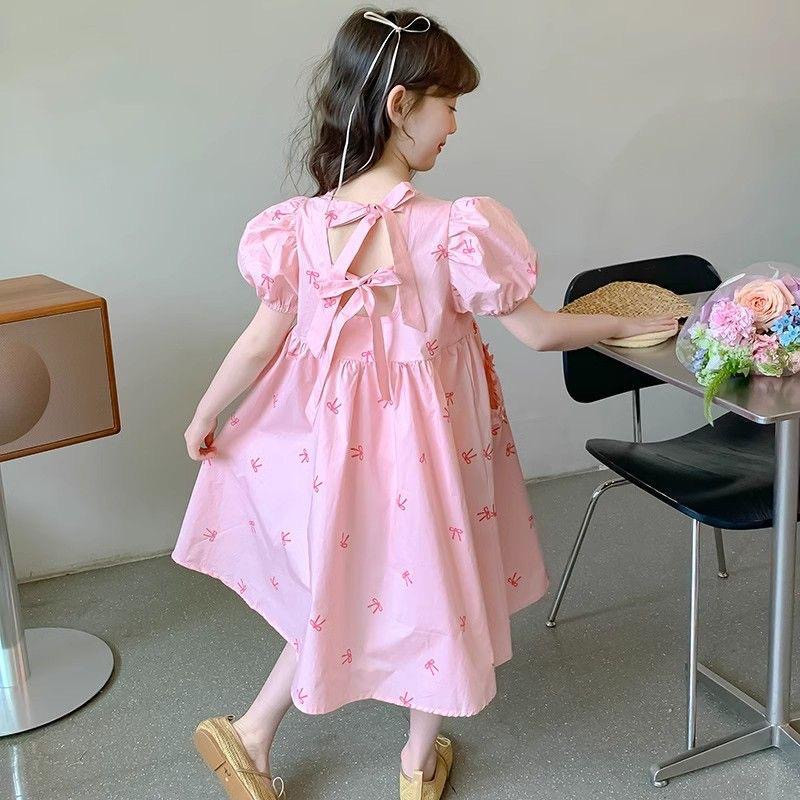 *فستان بناتي وردي بنقشة فيونكات وأكمام منفوشة*