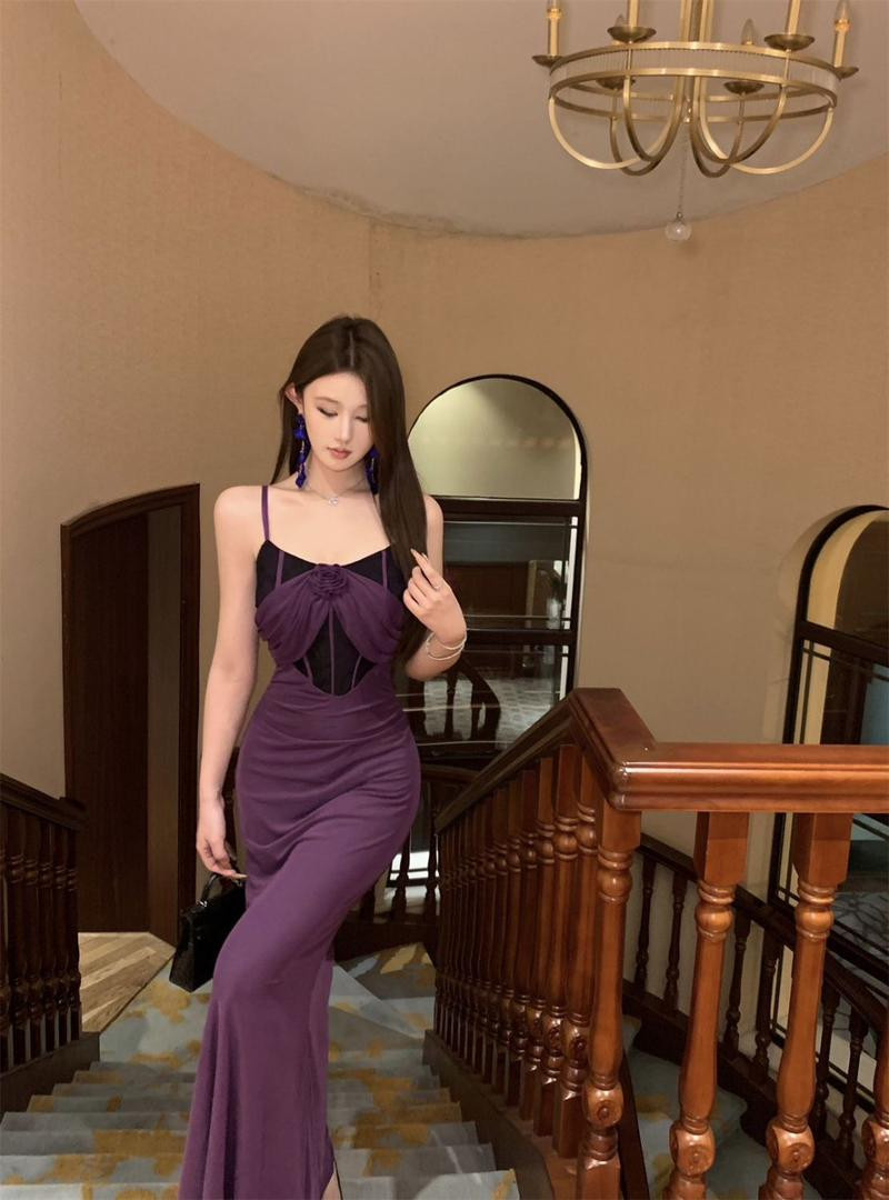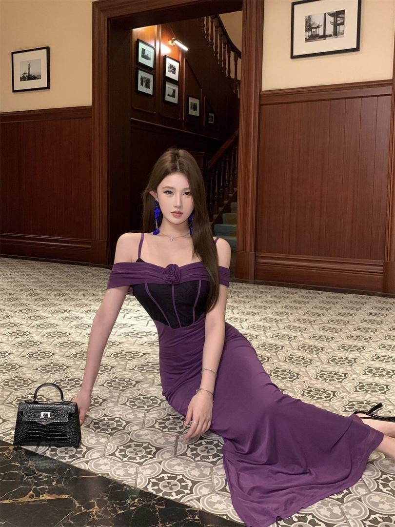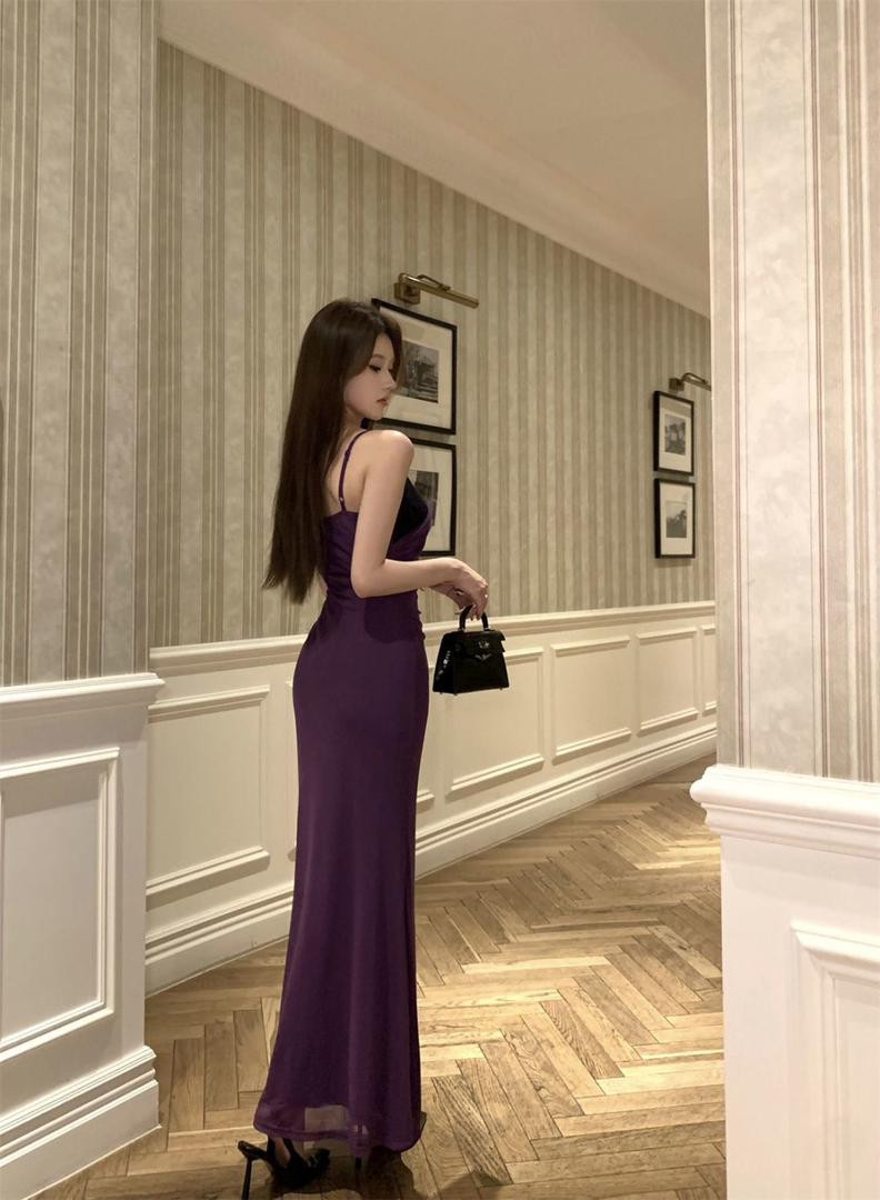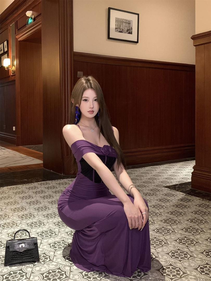 فستان بنفسجي فاخر بأكتاف ساقطة وتصميم ضيق يبرز القوام من قماش أنيق بلمسة راقية