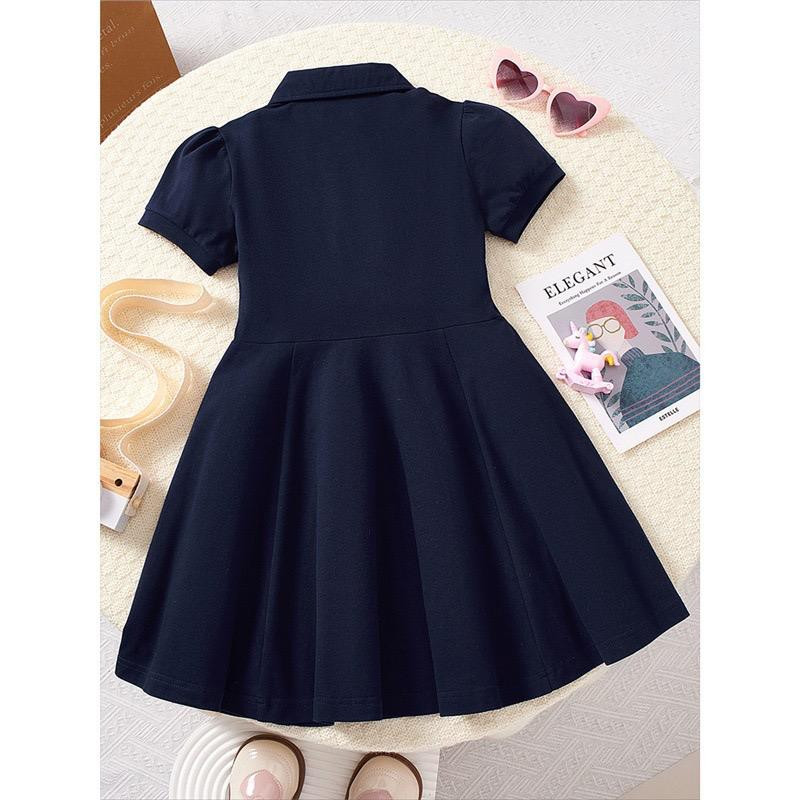 فستان جديد لصيف 2025 للبنات الصغيرات، فستان A-line مطرز للأطفال، بأكمام قصيرة بلون واحد بأسلوب أكاديمي للأطفال الصغار والكبارl