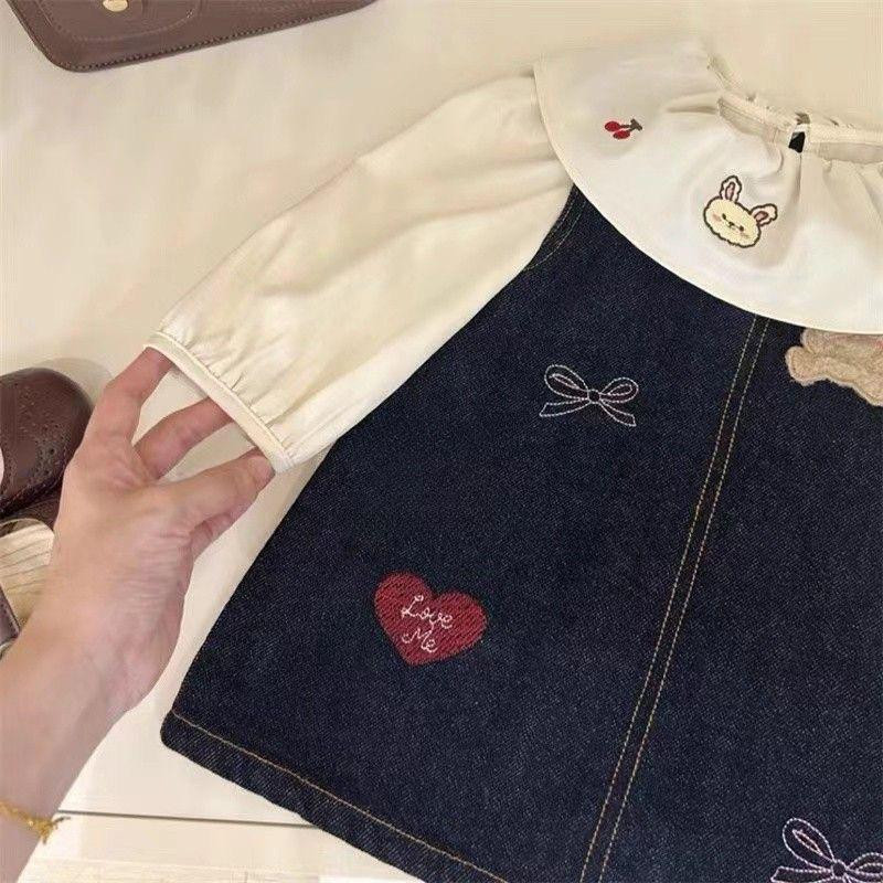 فستان جينز للبنات الصغيرات بتصميم كوري أنيق، مزين بتطريز دب لطيف