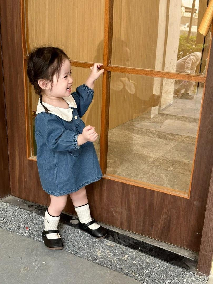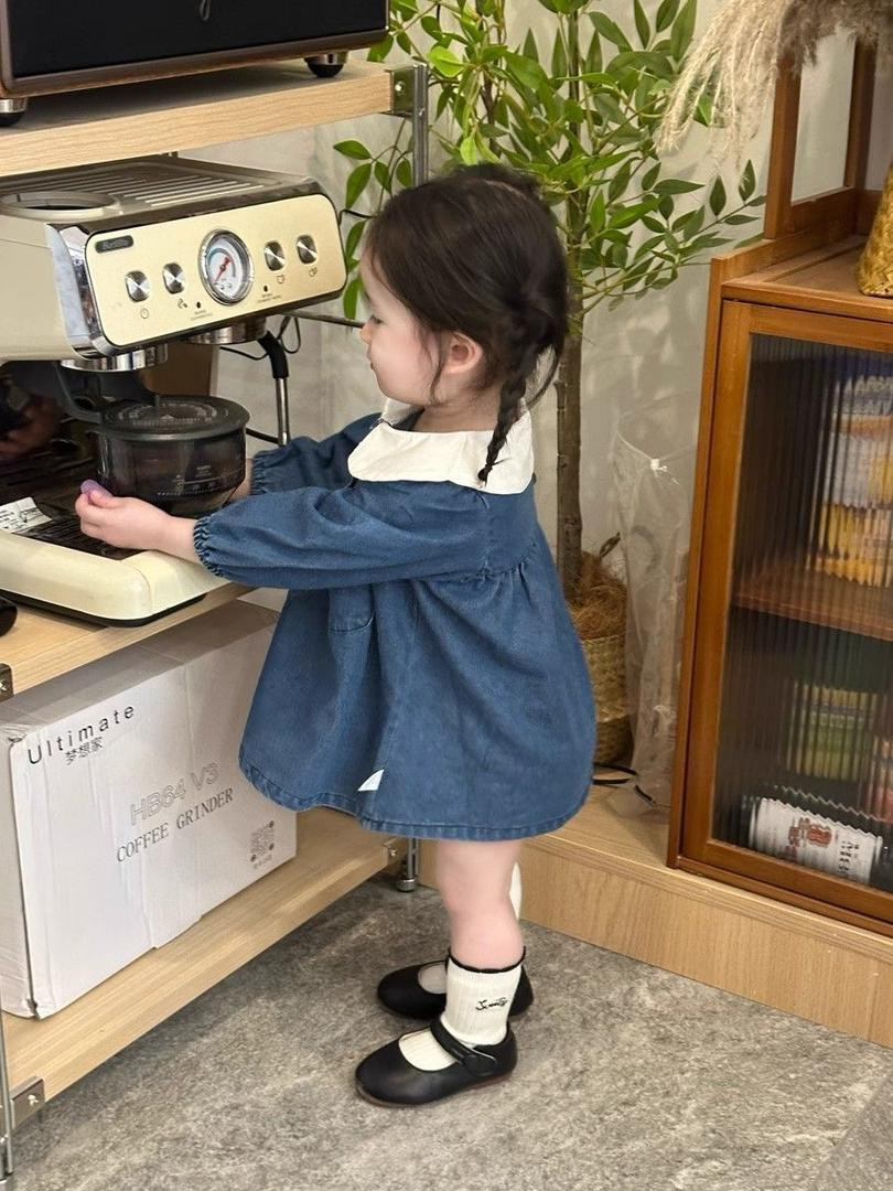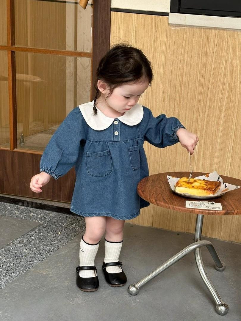 فستان جينز للبنات – بياقة– كم طويل، ناعم ومناسب للربيع والخريف، ستايل كوري أنيق وأميري)