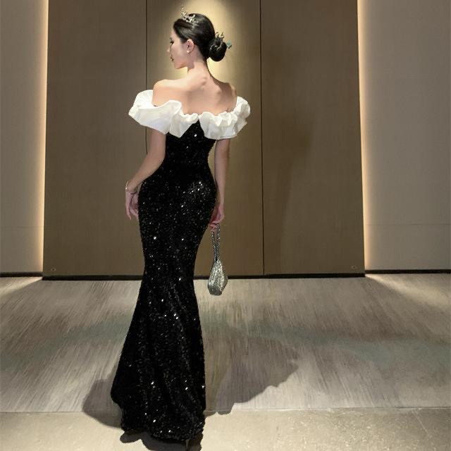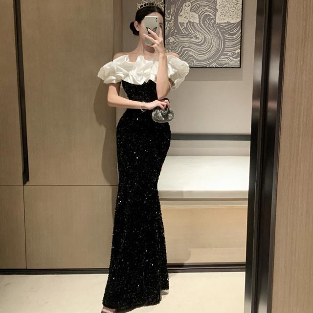 فستان مخملي أسود بكتف واحد مزين بالترتر، دانتيل طويل، ربط جمالي، تنورة طويلة
