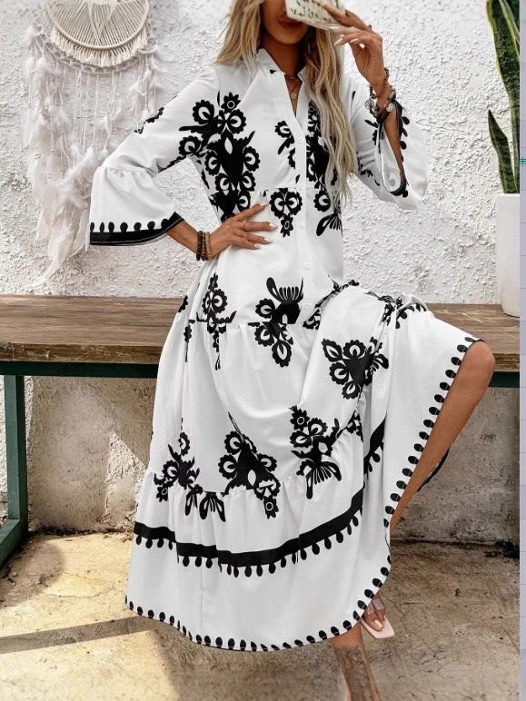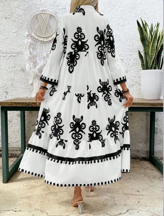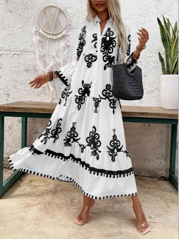 فستان مطرز أبيض مزخرف بالورود السوداء
