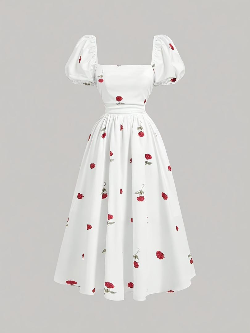 فستان مزين بنقش كرز، تصميم منفوش بأكمام قصيرة