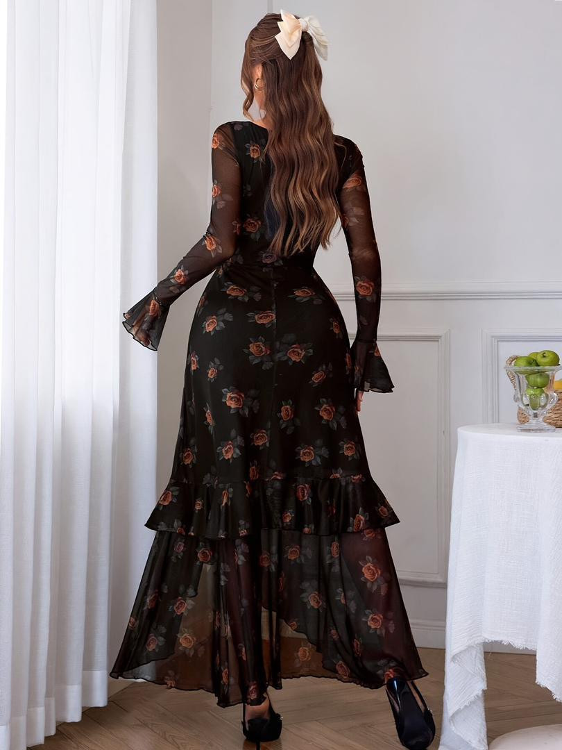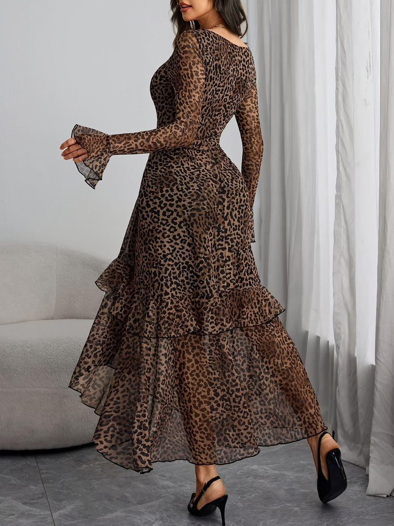 فستان نسائي أنيق بتصميم أوروبي-أمريكي فاخر بنقشة جلد النمر بياقة مربعة وفتحة جانبية