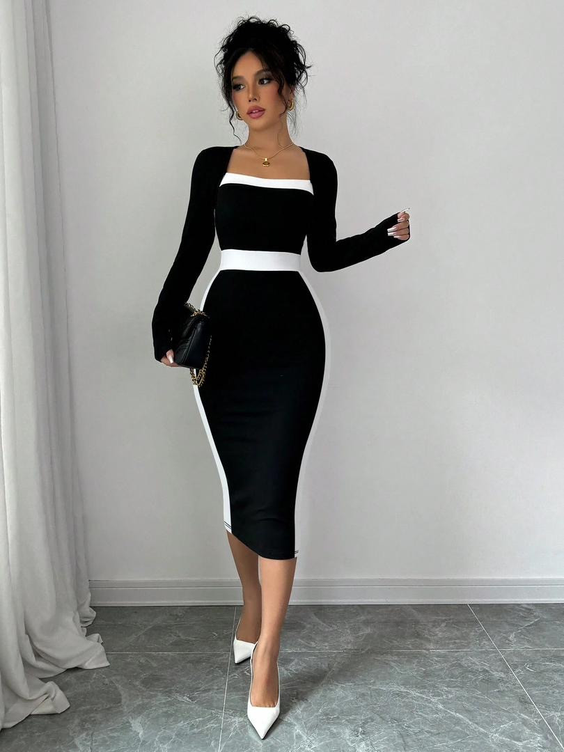 فستان نسائي أسود ضيق بأكمام طويلة – ستايل شيك