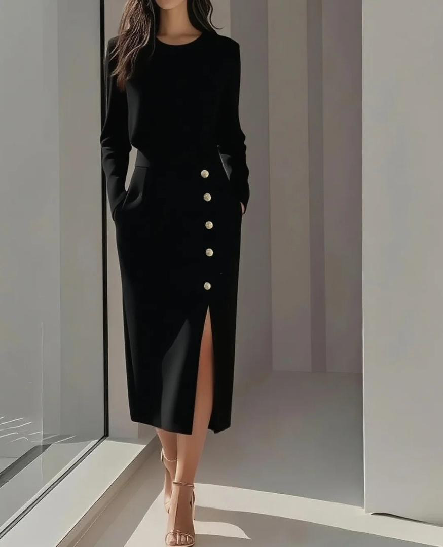 فستان نسائي بأكمام طويلة بلون موحّد، بياقة دائرية وزرّ ديكور، وقصّة ضيّقة مع فتحة جانبية