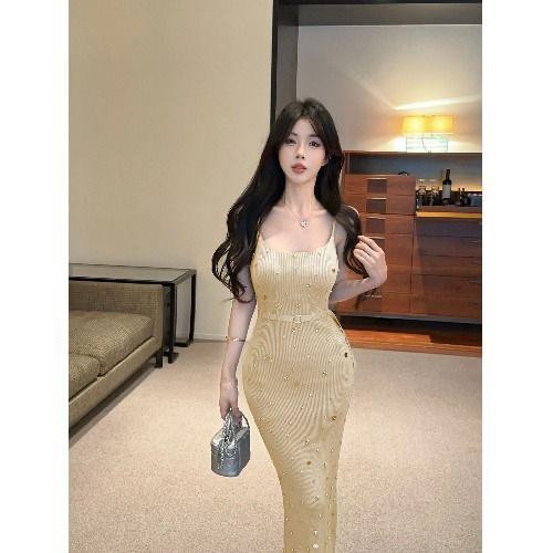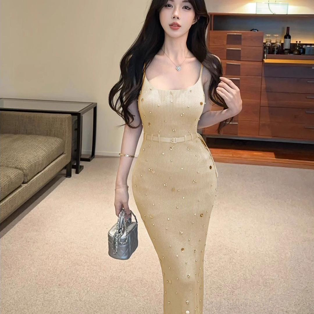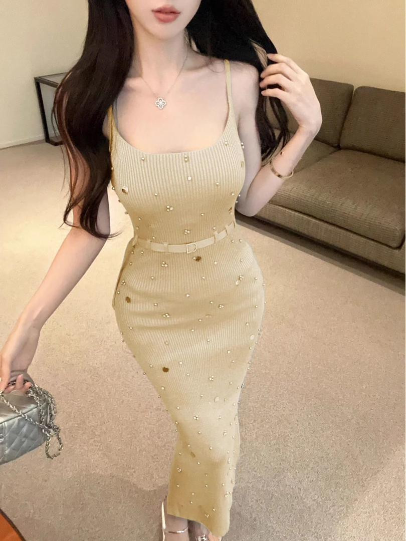 فستان نسائي صيفي بتصميم فرنسي أنيق، قماش محبوك بحمالات مع تطريز بالخرز والترتر، متوسط الطول، ضيق لإبراز القوام ويعطي مظهر رشيق وراقي.