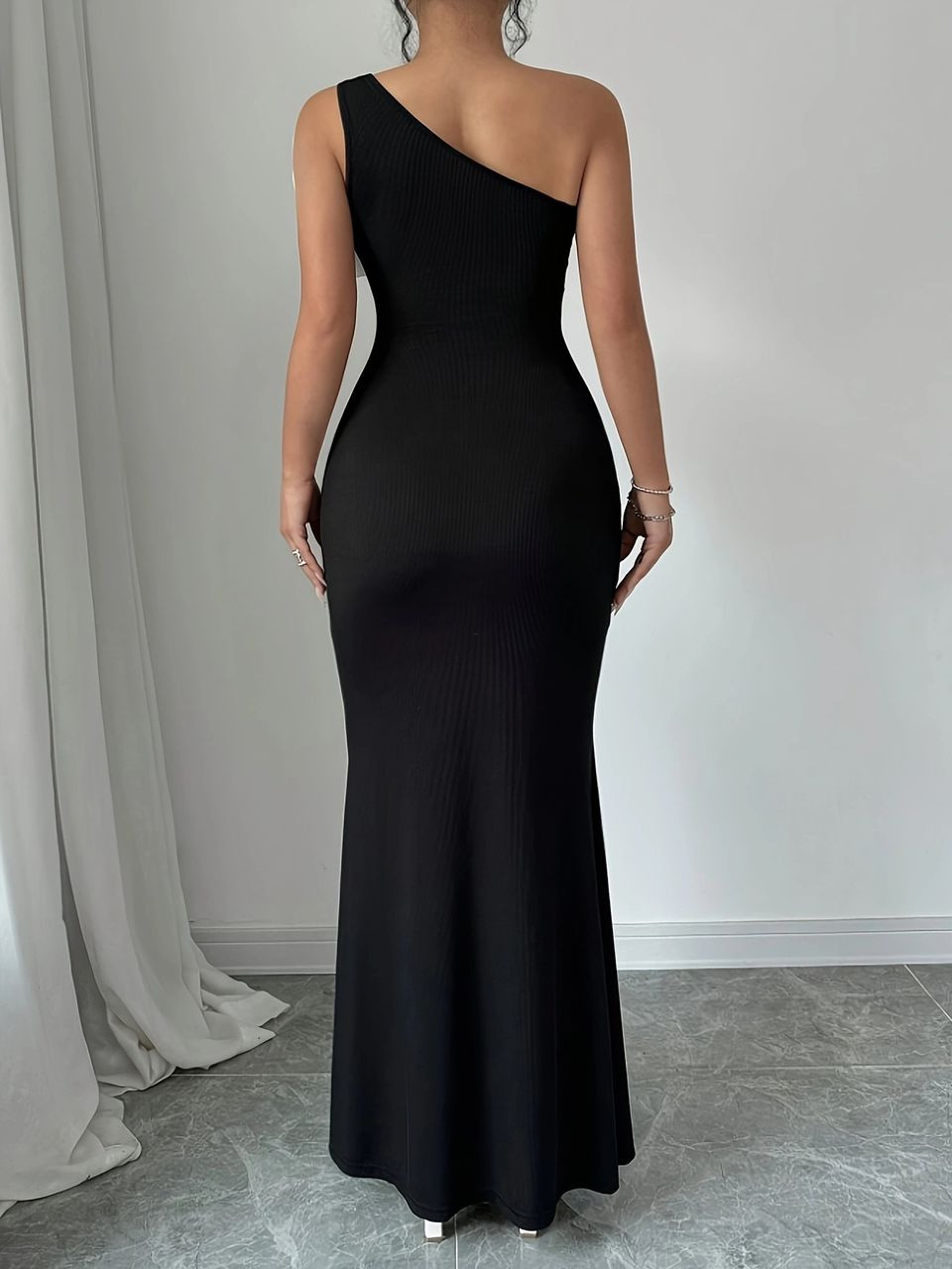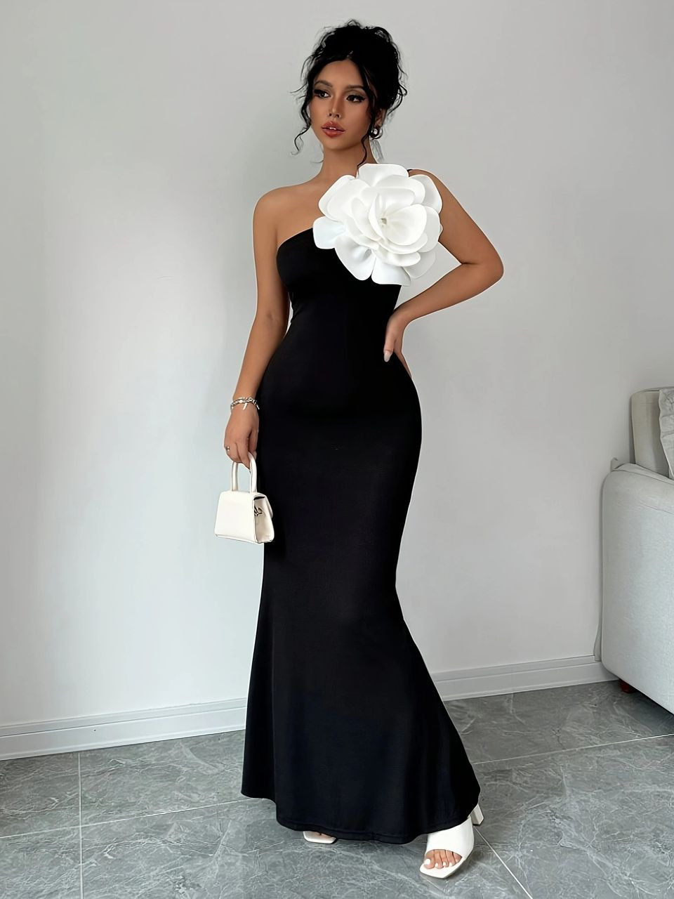 فستان نسائي طويل أنيق، بلون موحّد، بياقة غير متماثلة بدون أكمام، مزين بزهرة تزيينية