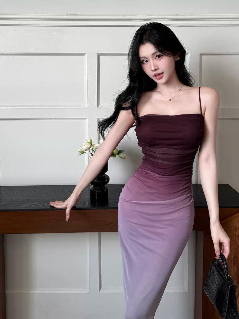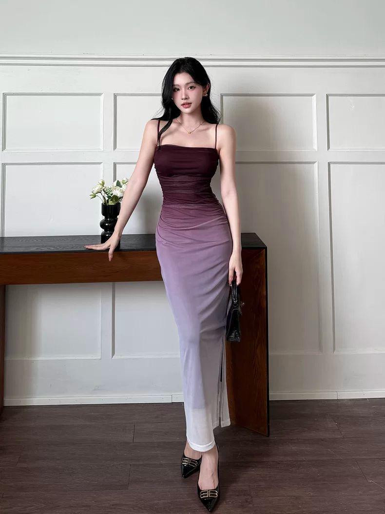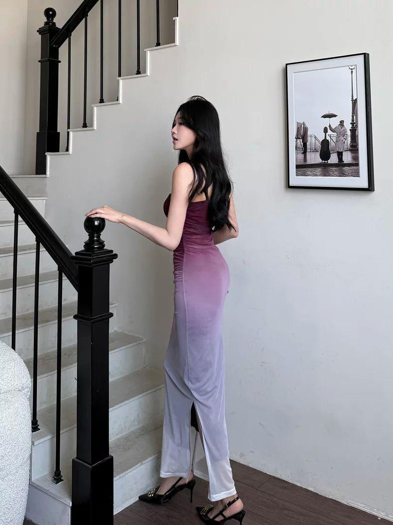فستان نسائي طويل بلون بنفسجي متدرج من الشيفون الشفاف، تصميم بحمالات، أنيق وراقي، ضيق لإبراز القوام، ستايل جذاب مناسب كفستان سهرة أو حفلات.