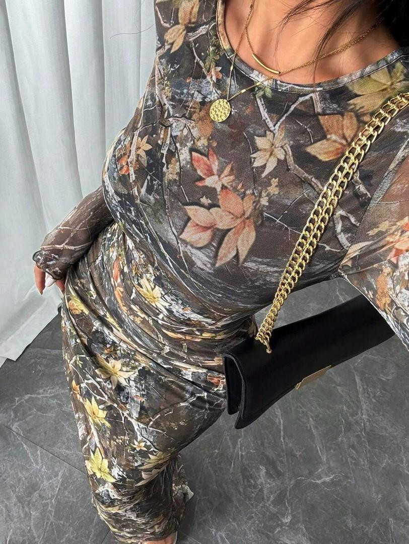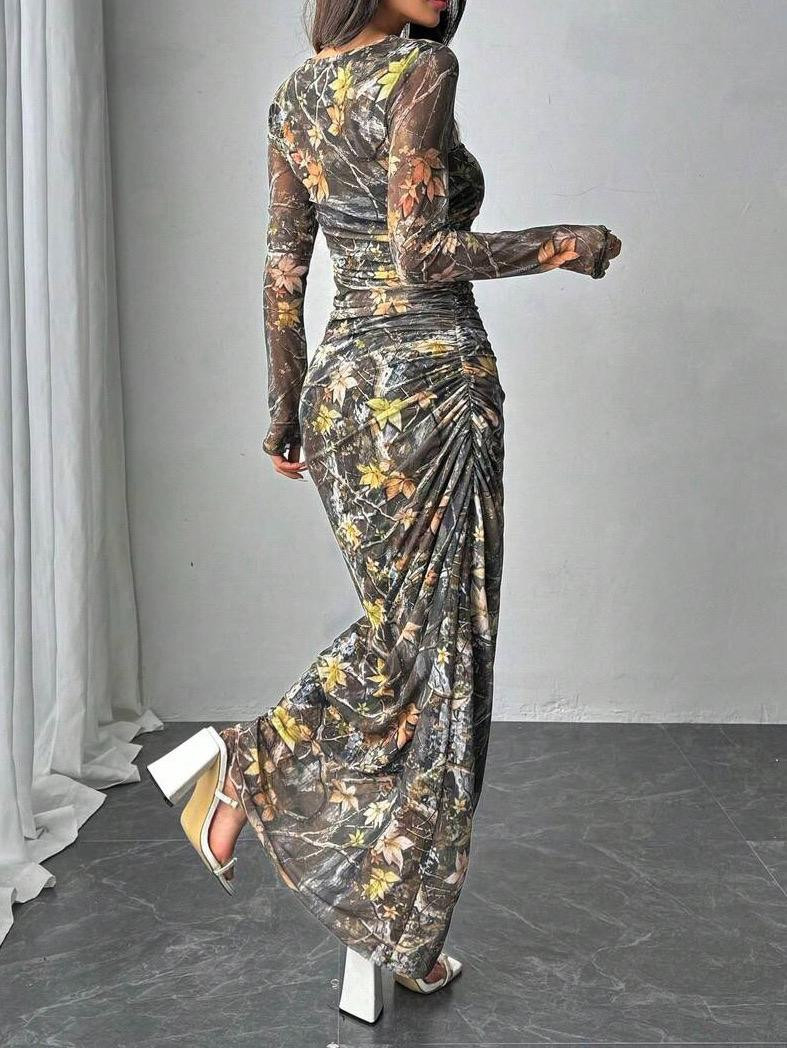 فستان نسائي طويل جدًا بطبعة (تمويه/أوراق شجر) بتصميم عصري مع كشكش وصبغة مربوطة، أكمام طويلة