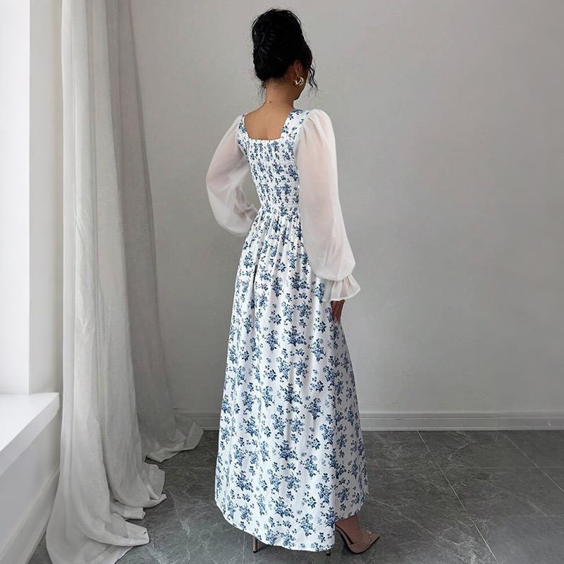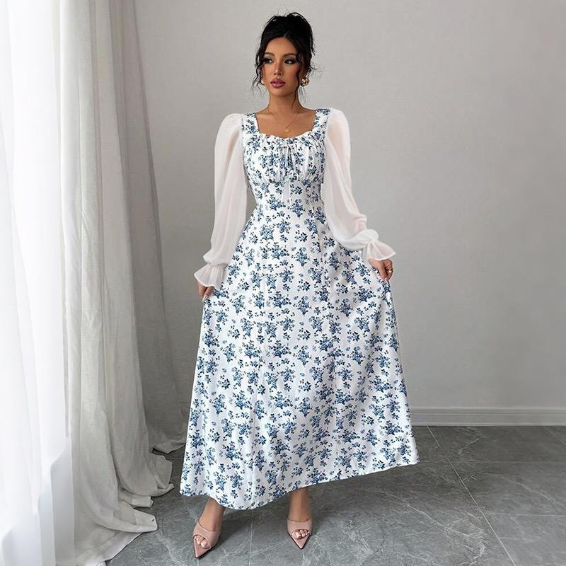 فستان نسائي طويل مطبوع – أبيض بأزهار