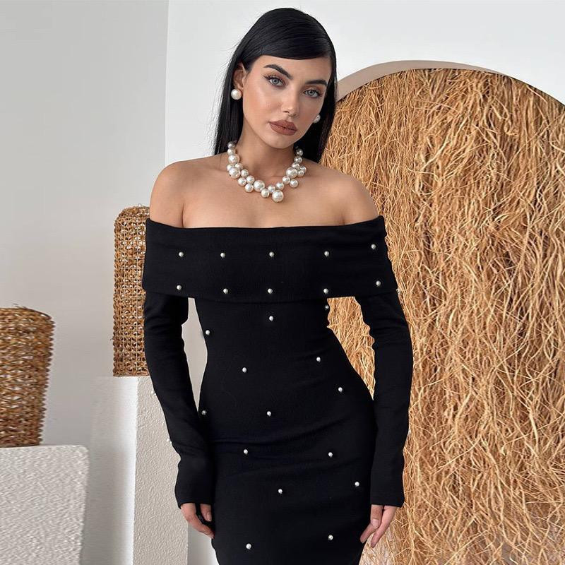 فستان سهرة بأكتاف مكشوفة مزين باللؤلؤ على الطراز الأوروبي والأمريكي، 2025 خريف جديد، موضة عبر الحدود، أنيق بقصة ضيقة لإبراز القوام