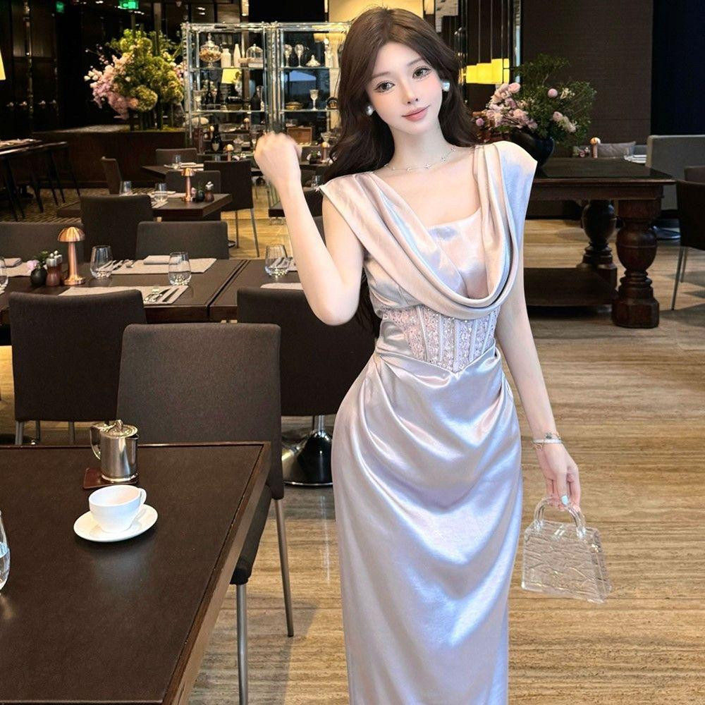 فستان سهرة فاخر بطابع فرنسي راقٍ، تصميم ياقة متدلية، خصر محدد لإطلالة نحيفة، مصنوع من قماش الساتان الفاخر ومزين بدانتيل أنيق