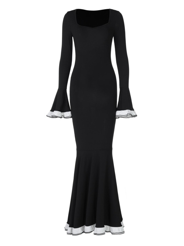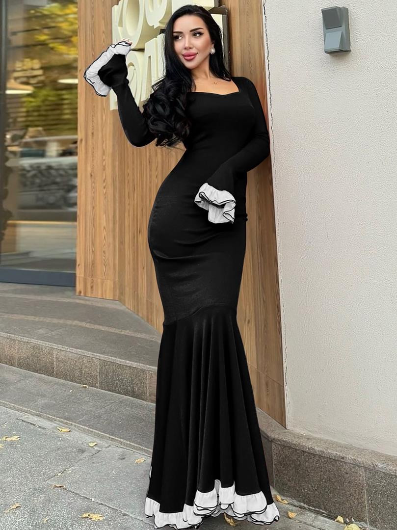 "فستان طويل بتصميم ضيق وأطراف مزخرفة باللون الأسود"
