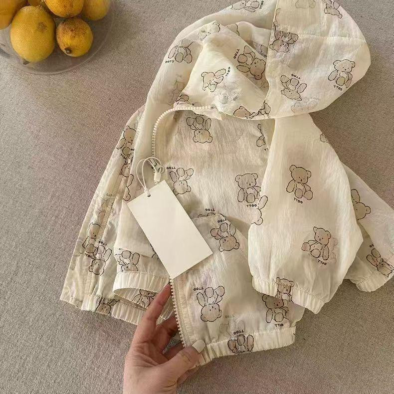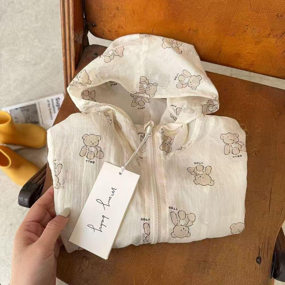 جاكيت أطفال خفيف جداً – صيفي – واقٍ من الشمس – أولاد – بأكمام طويلة – برسمة دب صغير مطبوع بالكامل – مع قبعة