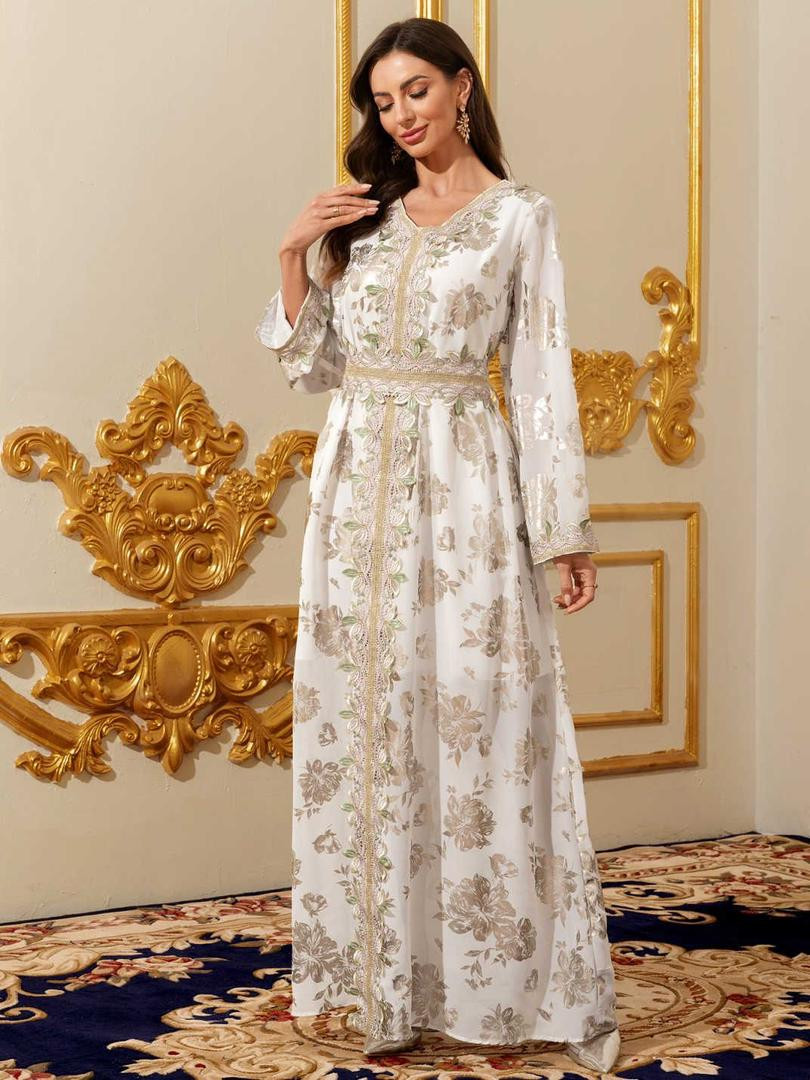 جلابية عربي طويل دانتيل بأكمام طويلة وياقة V أنيقة