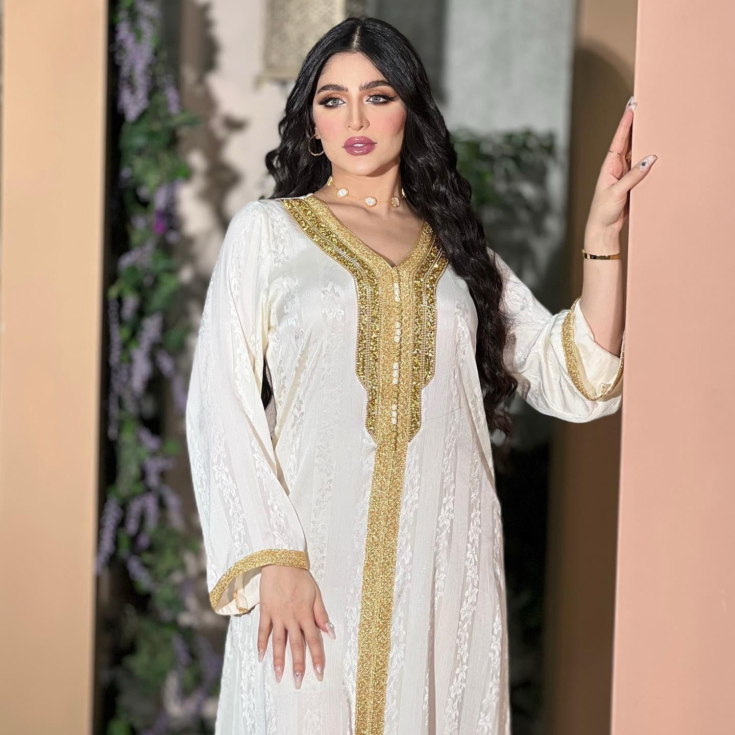 "جلابية باللون الأبيض مع تطريز ذهبي"
