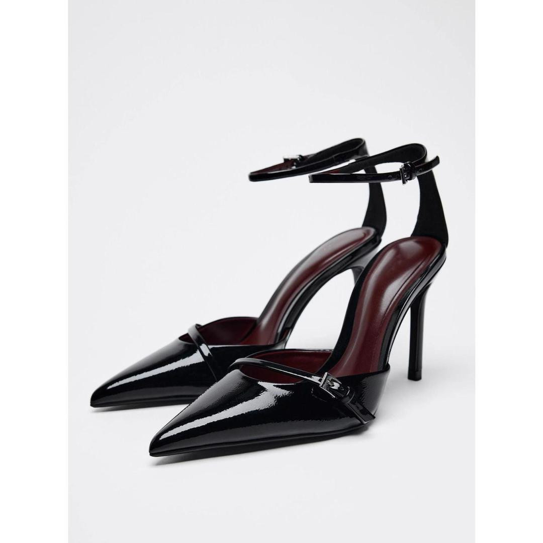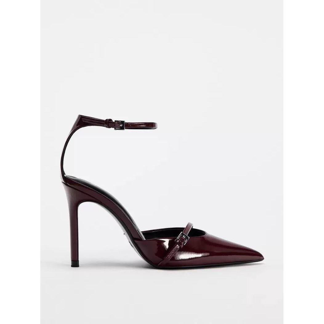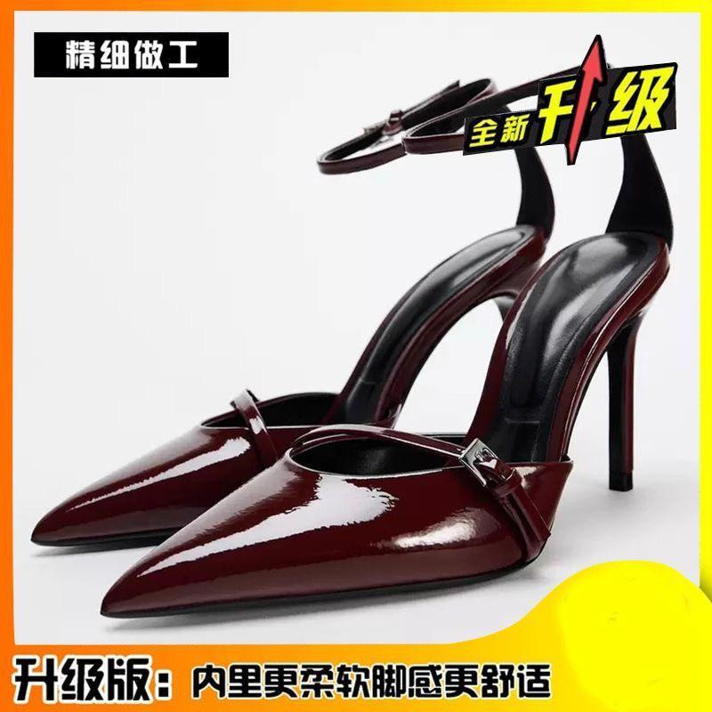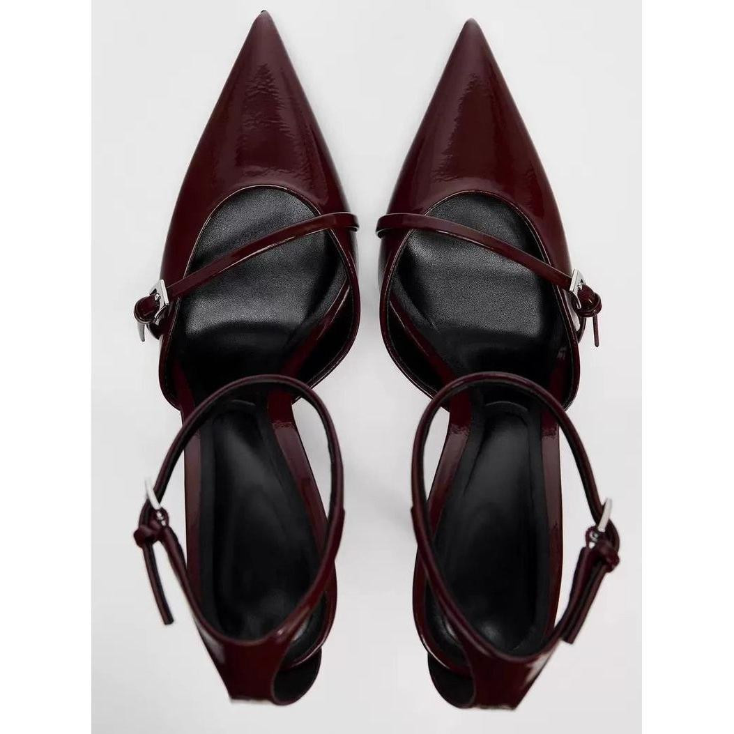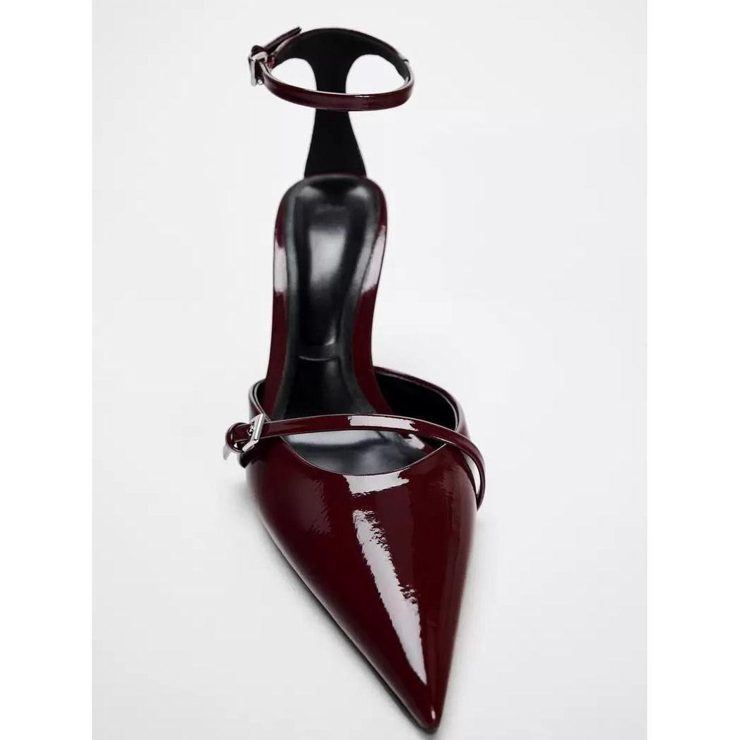 حذاء نسائي فاخر بتصميم خريفي لعام باللون النبيذي اللامع، مقدمة مدببة وحزام أنيق من الأمام