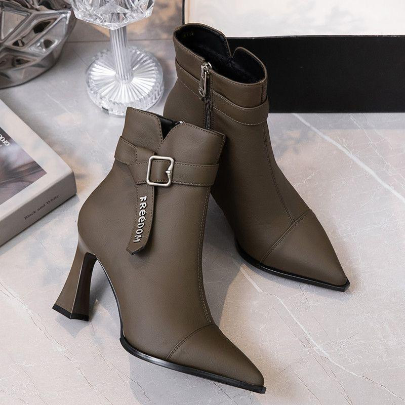 كعب عالي نسائي بوت كاحل بقدّام مدبّب، بحزام معدني وتفاصيل سِحّاب