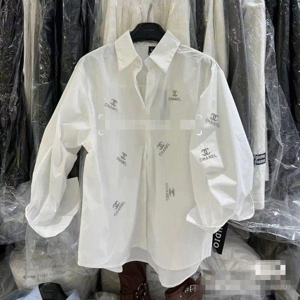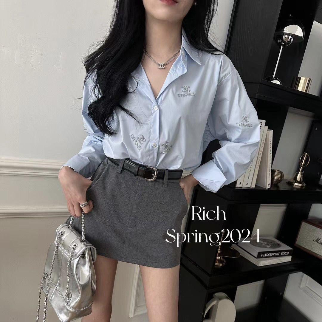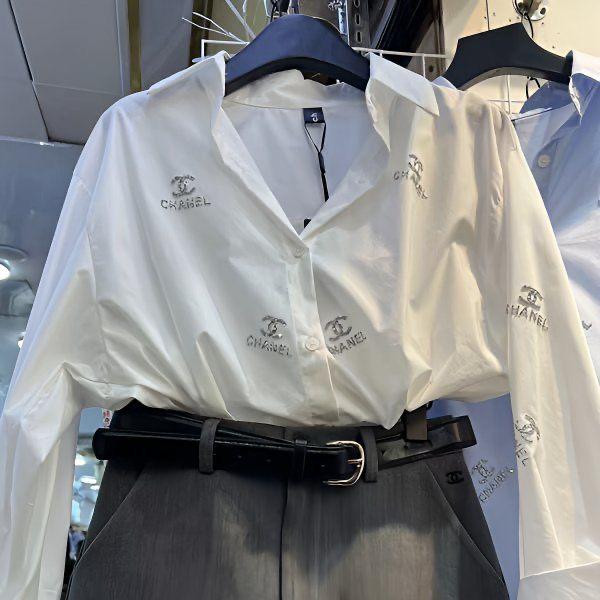 قميص نسائي طويل الأكمام ماركة فاخر بزخرفة كريستال (متوفر باللون الأبيض والأزرق)