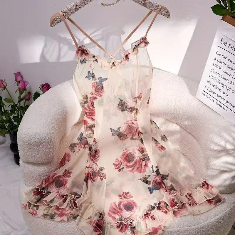 لانجري نسائي قصير مع شورت داخلي (تصميم مزهر بحمالات رفيعة)