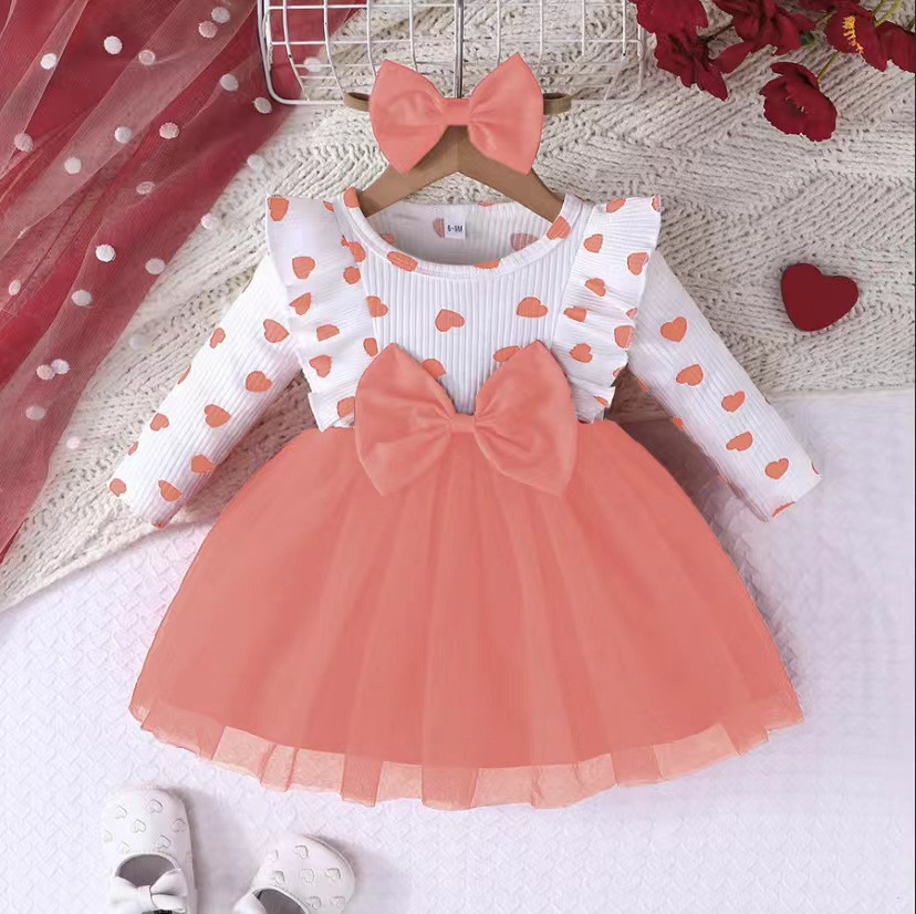 ملابس الأطفال لطيف الحب المطبوعة القوس فستان بأكمام طويلة وغطاء الرأس