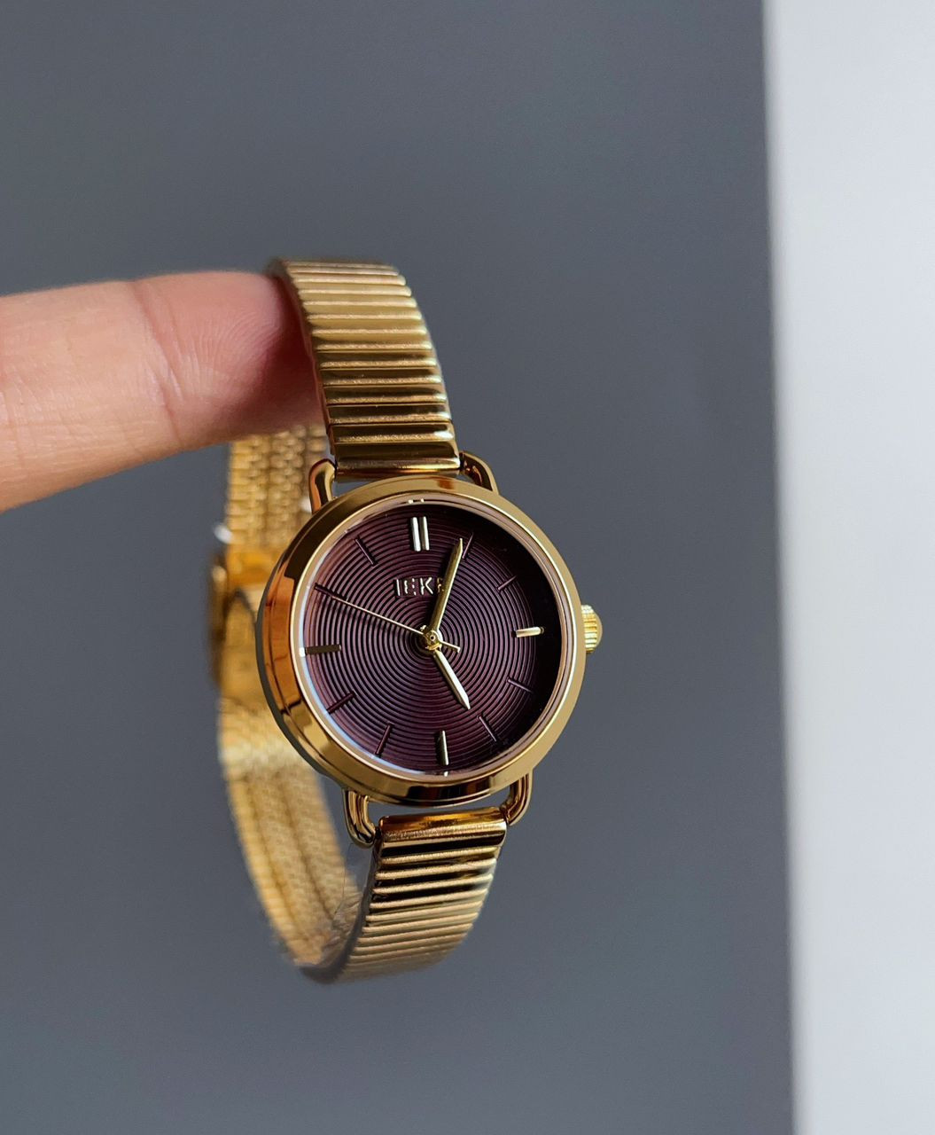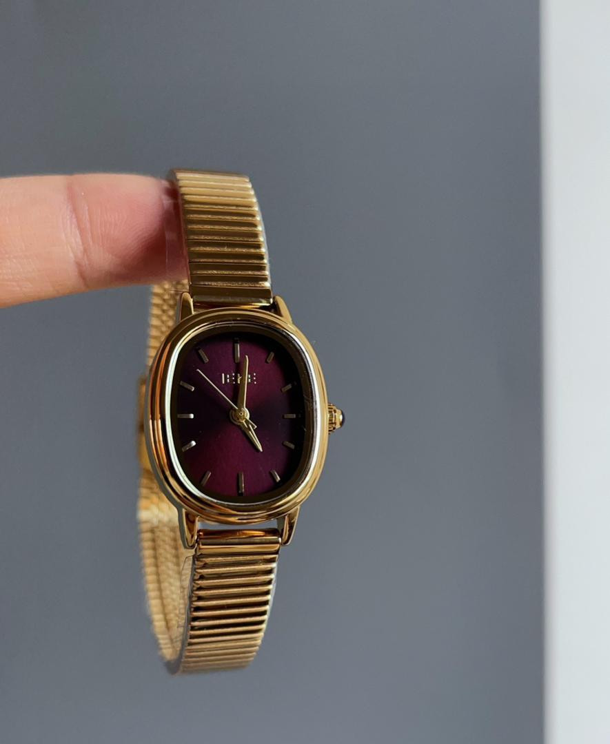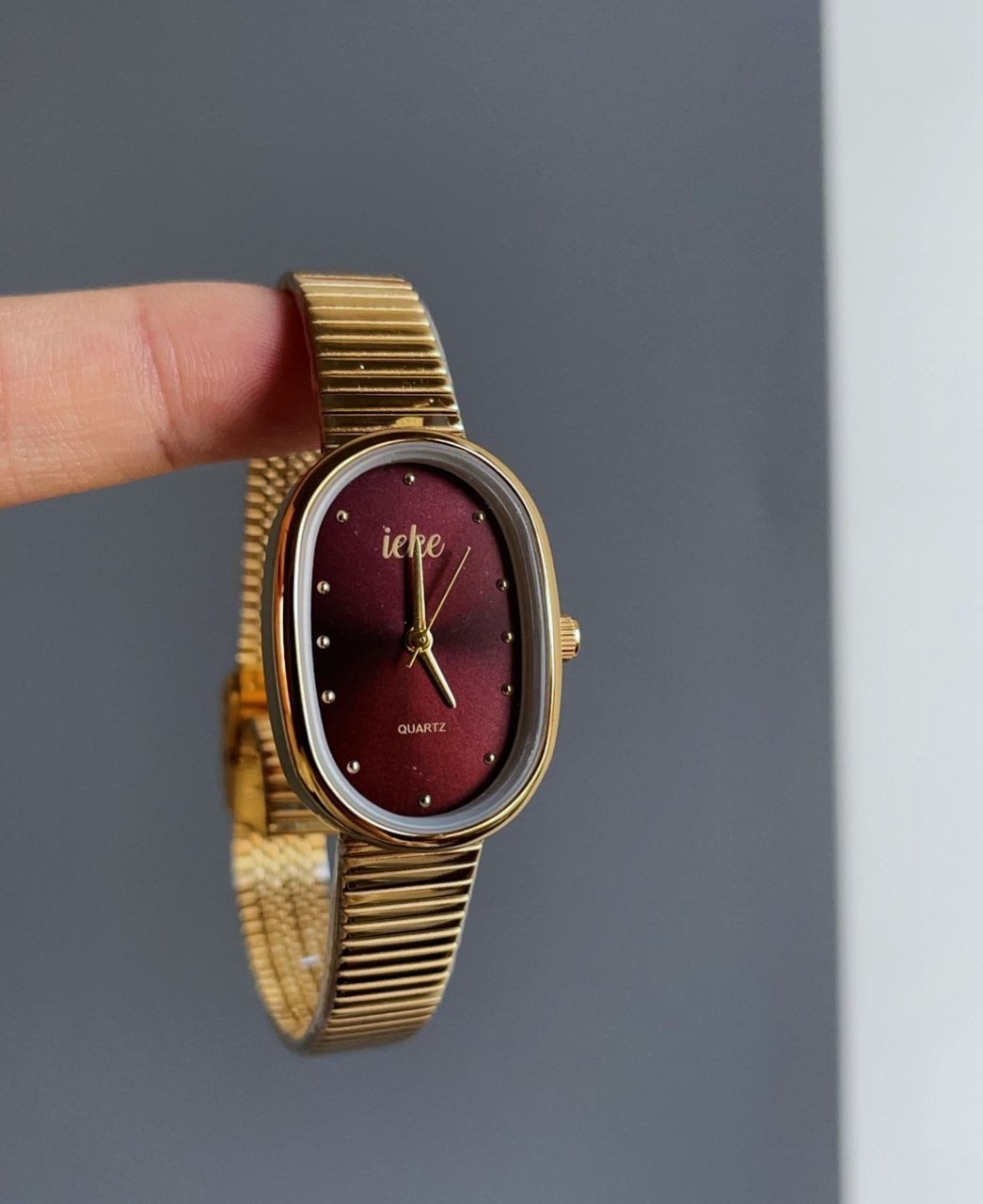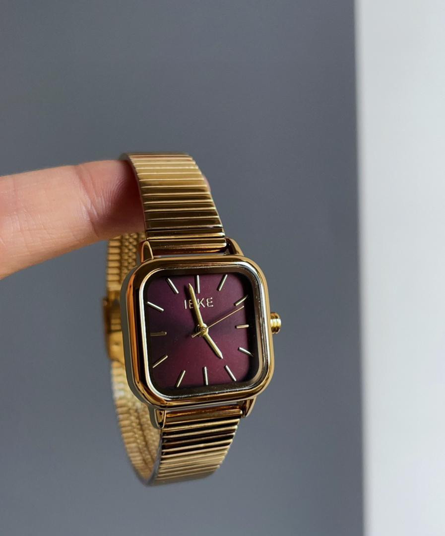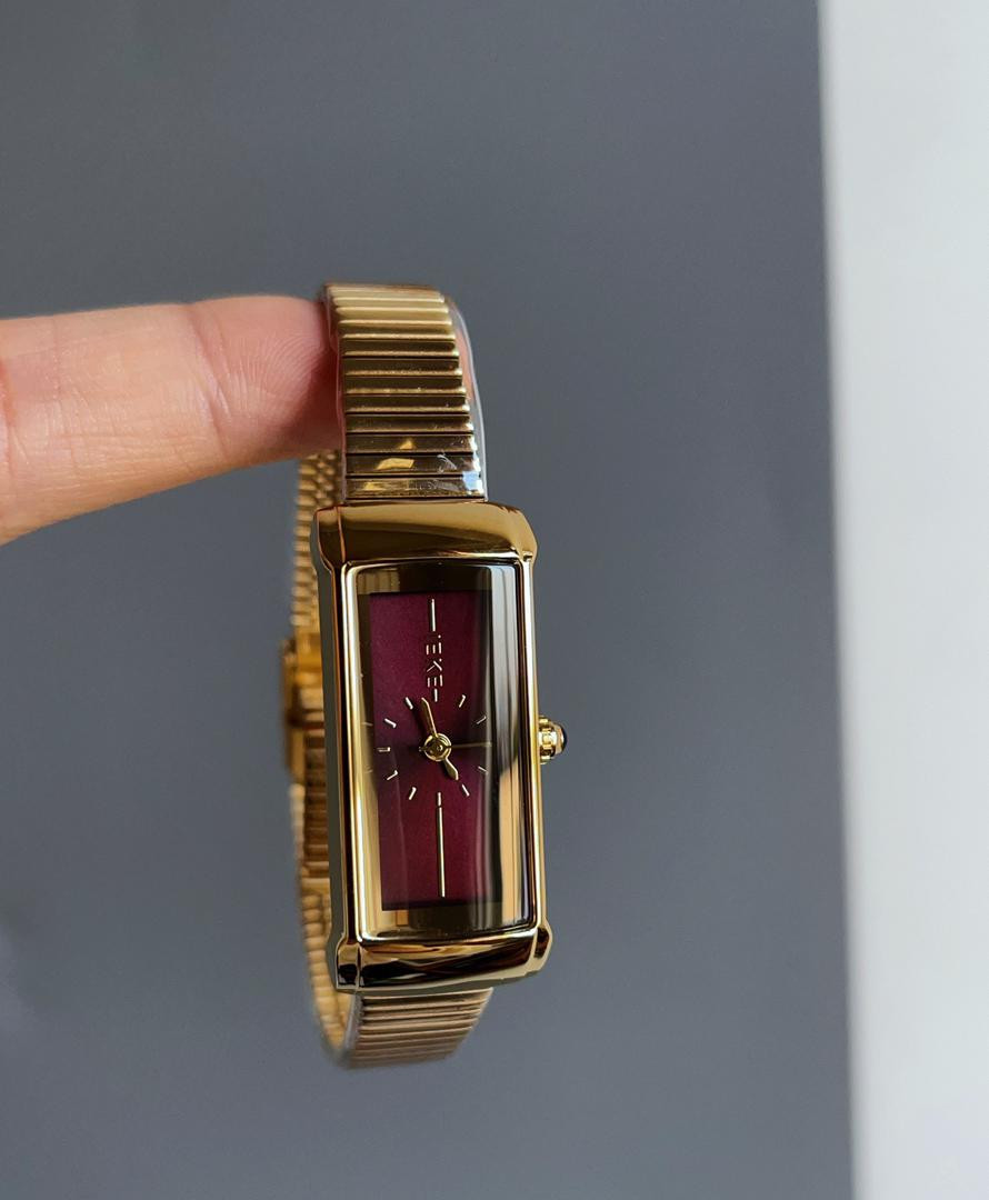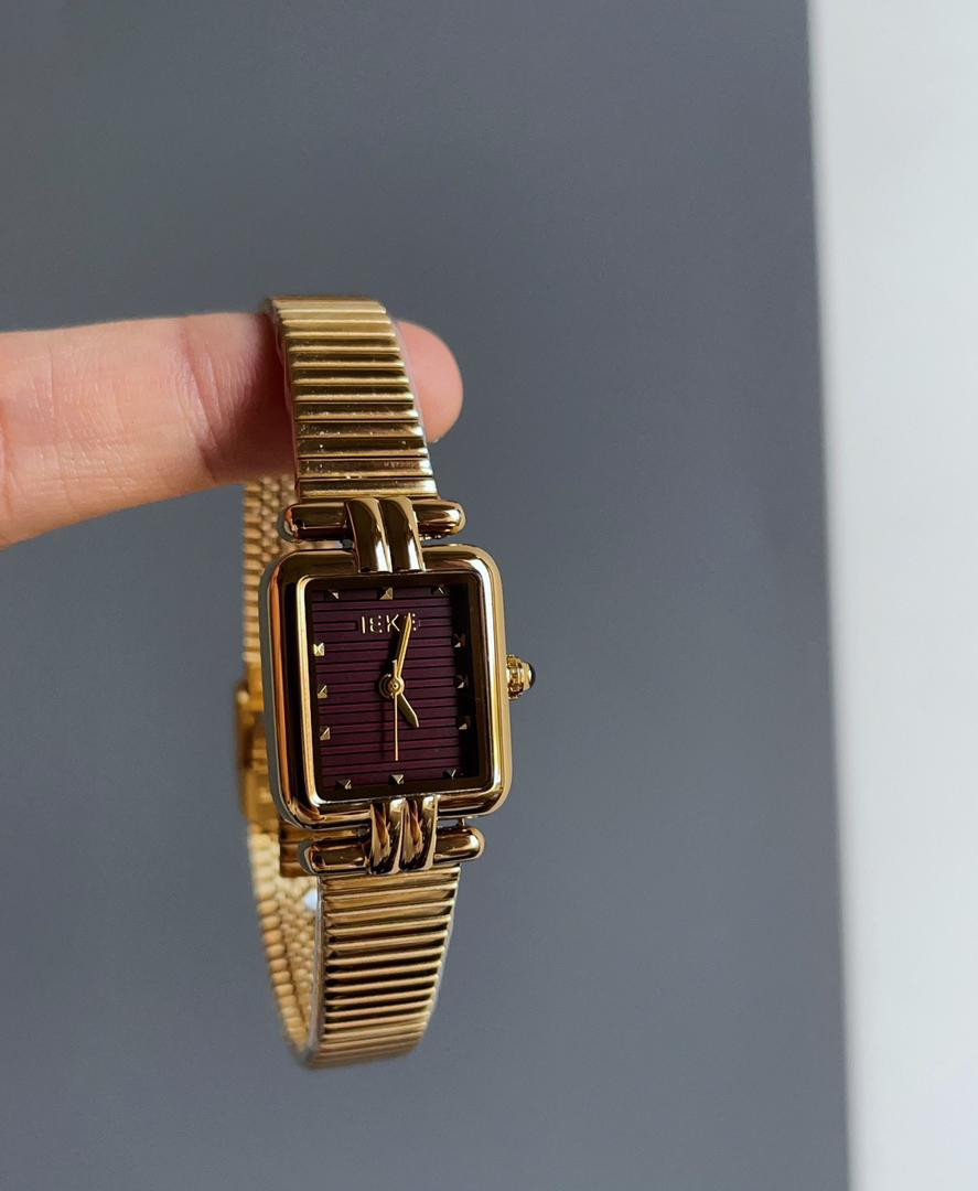 ساعة يد نسائية أنيقة بسوار معدني ذهبي بتصميم مربع، ميناء باللون الأحمر النبيذي، تجمع بين الفخامة والبساطة لإطلالة راقية
